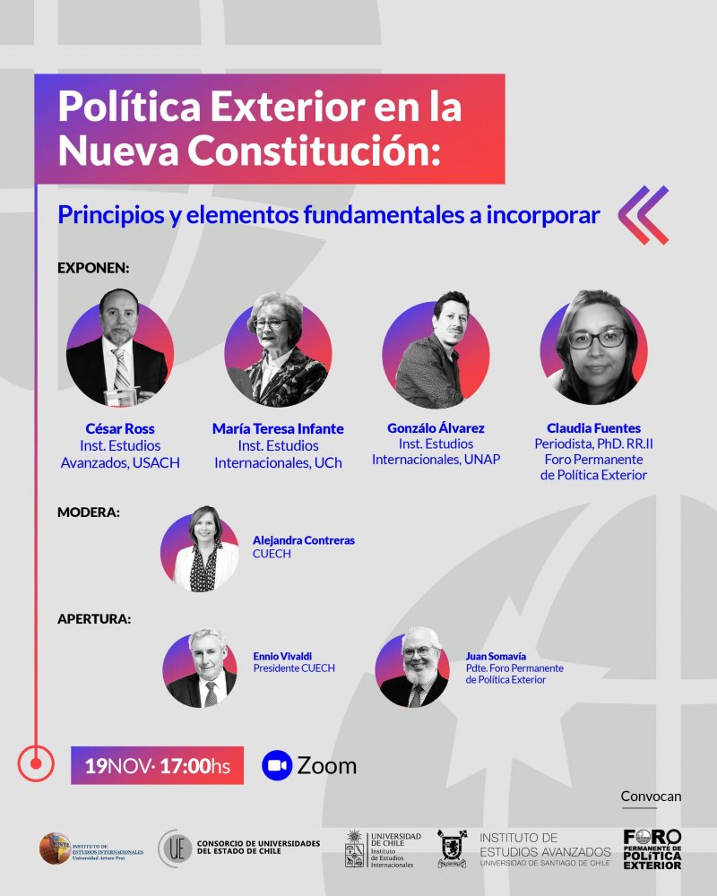 El evento, tendrá lugar el jueves 19 de noviembre a las 17:00 horas, forma parte de una serie de actividades colaborativas que están realizando los institutos de estudios internacionales pertenecientes a las casas de estudio que integran el Consorcio de Universidades del Estado de Chile (CUECH) junto al Foro Permanente de Política Exterior, y que buscan aportar -desde sus distintos enfoques y desarrollos académicos e investigativos- al debate público, en particular a la construcción de la política exterior del país.
