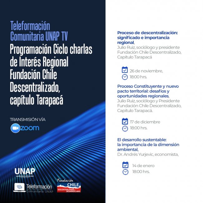 "Este ciclo de charlas es una iniciativa inédita orientada al medio social-comunitario en un contexto de pandemia, implementada por la Dirección de Vinculación con el Medio de la UNAP en alianza con fundaciones españolas y chilenas, y que ahora se suma la Fundación Chile Descentralizado, para reflexionar sobre el destino de las regiones en el marco del actual proceso de descentralización, como el caso de la elecciones de los gobernadores, así como del proceso constituyente. Ambos elementos son parte de nuestra misión institucional, respecto a formar también ciudadanía activa para pensar una nueva relación entre el Estado y sus regiones", recalcó Jamett.