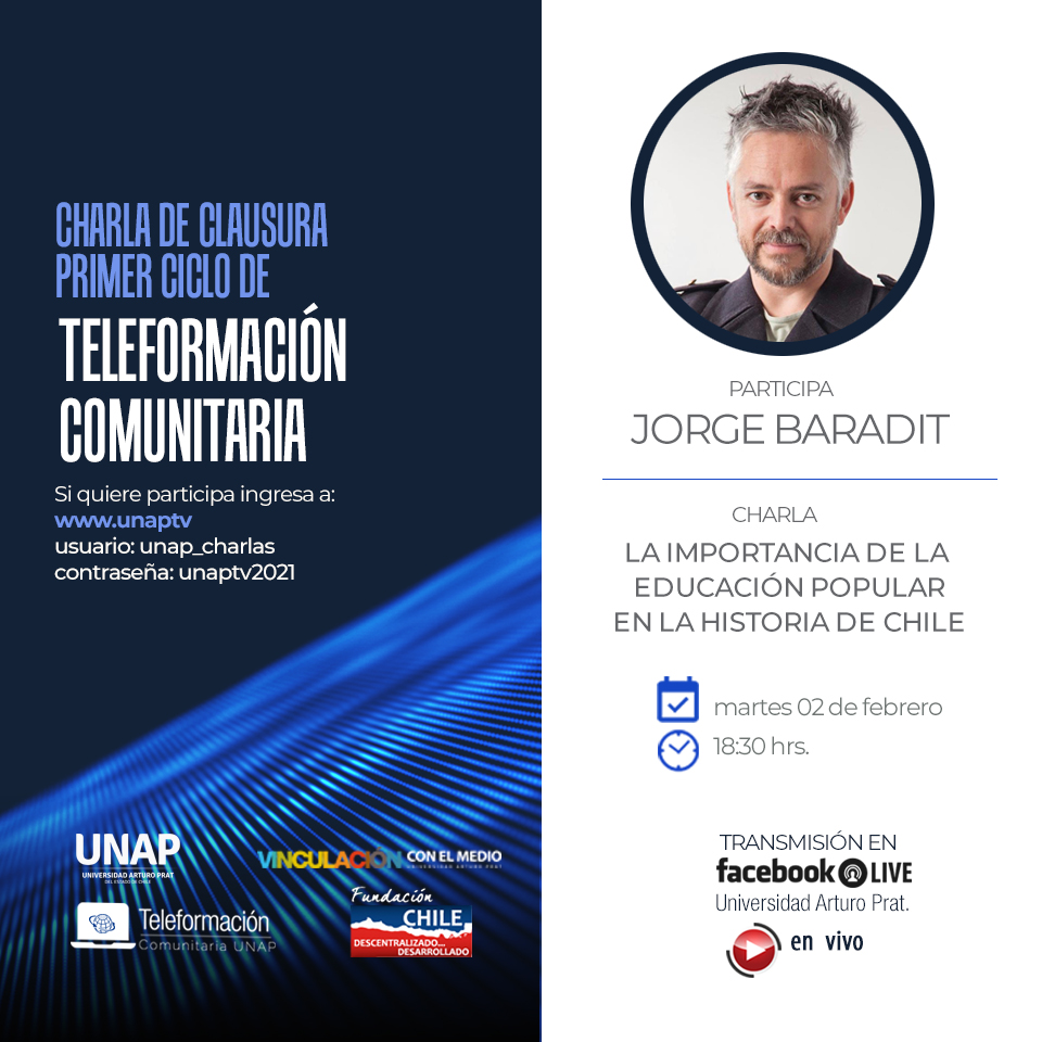 En Clausura 2020 de Plataforma Teleformación Comunitaria UNAP, Baradit dictará charla acerca de la educación popular en la historia de Chile