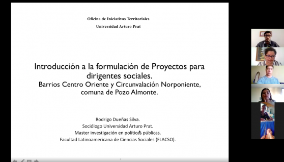 El pasado jueves 25 de febrero de 2021, se llevó a cabo el primer módulo de la capacitación “Introducción a la formulación de proyectos para dirigentes sociales” ofrecida por la Oficina de Iniciativas Territoriales de la Universidad Arturo Prat en coordinación con el Equipo Municipal del Programa Quiero Mi Barrio (Municipalidad de Pozo Almonte/MINVU).
