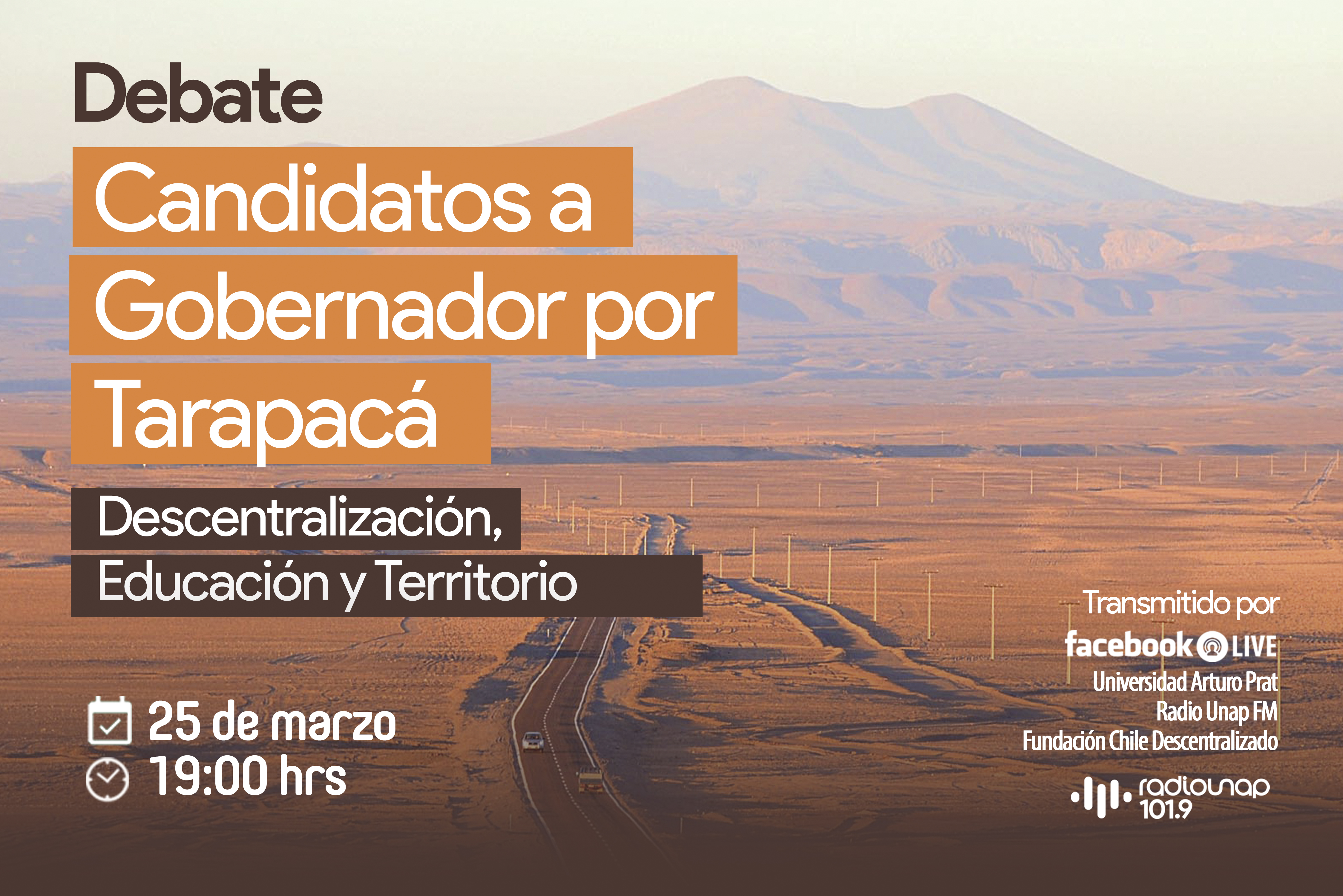Acercar las propuestas programáticas a la ciudadanía y generar un debate de ideas acerca de los desafíos para la región, es el tenor del debate virtual “Candidatos a Gobernador por Tarapacá. Descentralización, Educación y Territorio”, que se realizará el próximo jueves 25 de marzo, a las 19 hrs., por plataforma la zoom.