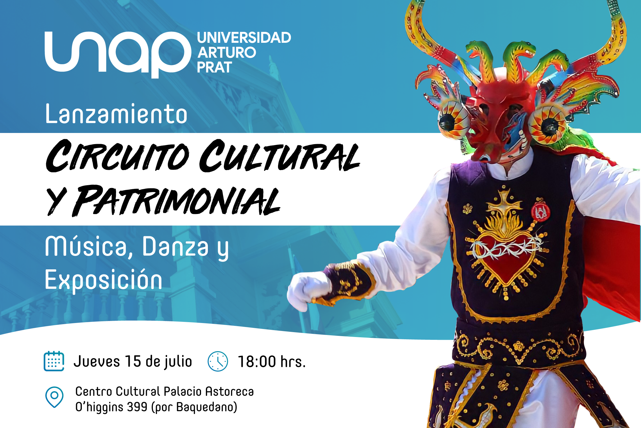 En el marco del programa “Circuito Cultural y Patrimonial” perteneciente a la Dirección General de Vinculación con el Medio y Relaciones Internacionales UNAP, invita a la comunidad universitaria y público en general a presenciar este día jueves 15 de julio el lanzamiento del “Portal web patrimonio y cultura UNAP”. A contar de las 18:00, nos encontraremos en la avenida patrimonial Baquedano, al costado del Palacio Astoreca esquina calle O’Higgins, para presenciar un acto de inauguración y celebración junto a un concierto en vivo a cargo de la agrupación CAMERATA UNAP, y la presentación del ballet folclórico COFUNAP, además de otras grandes sorpresas. El programa “Circuito Cultural y Patrimonial” tiene dentro de sus objetivos resaltar nuestro patrimonio intangible, a través de las artes, las manifestaciones culturales, comunitarias y sociales, manifestando una importancia en la participación ciudadana.