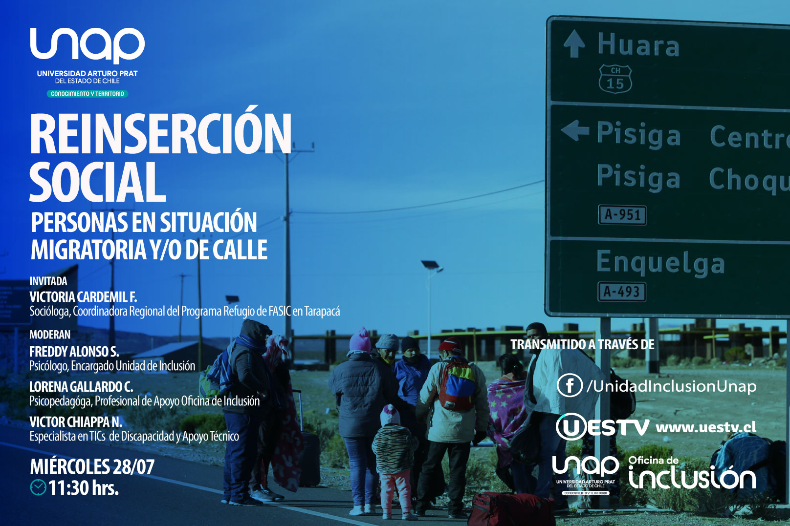 Este miércoles 28 de julio a partir de las 11:30 horas, a través del Facebook Live de Inclusión y transmitido por UESTV, se efectuará una nueva versión del Conversatorio “Reinserción Social, personas en situación migratoria y/o de calle”, una iniciativa a cargo de la Unidad de Inclusión de la Universidad Arturo Prat.