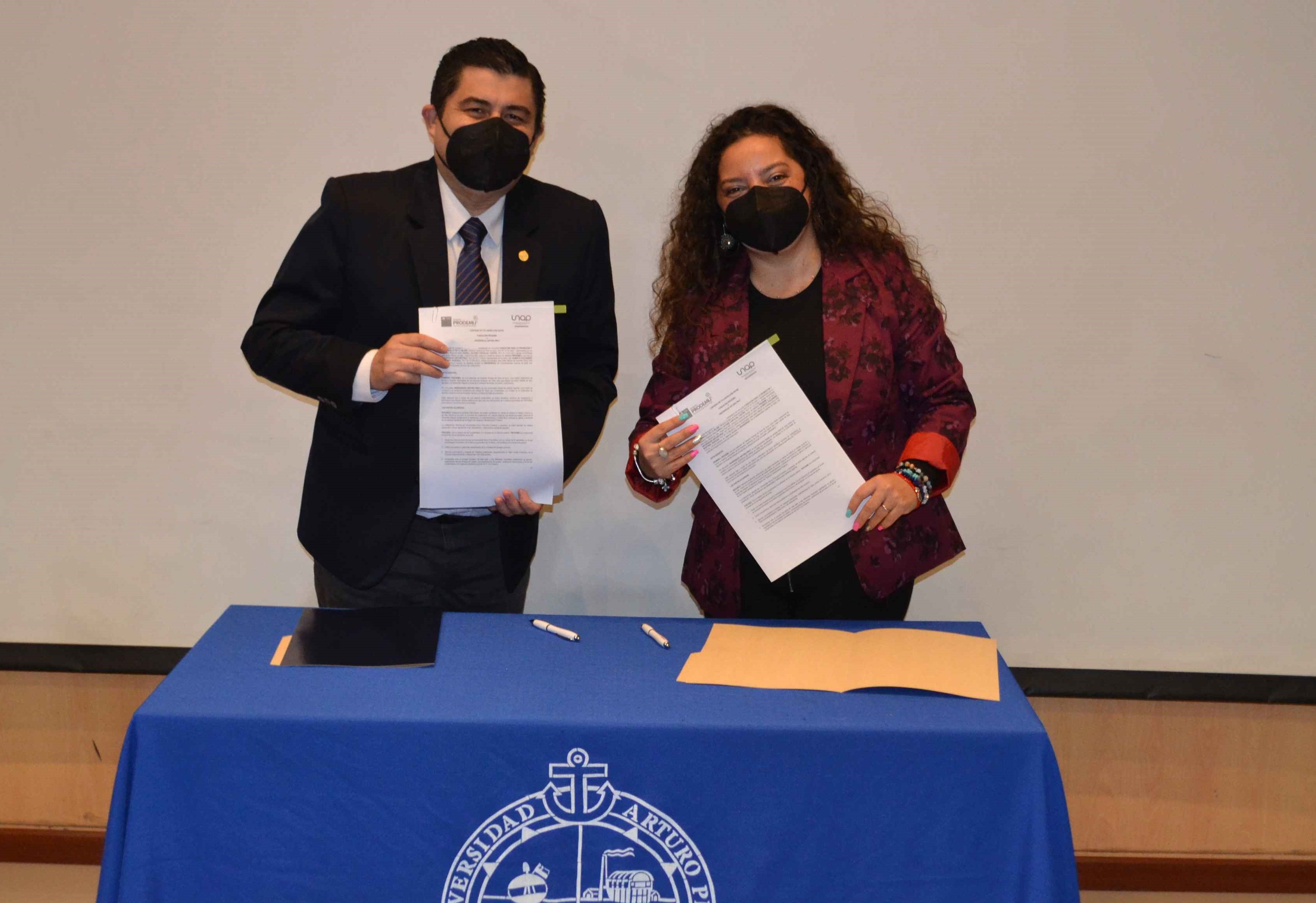 El auditorio Oscar Hahn fue el escenario donde el rector de la Universidad Arturo Prat , Alberto Martínez Quezada y la directora regional de PRODEMU Tarapacá, Karoll Carvajal Castro, suscribieran un convenio colaborativo a través del cual se oficializa el compromiso de que académicos de esta casa de estudios superiores ejecuten sesiones de capacitación técnica a las mujeres participantes del taller “Juntas Crecemos”.