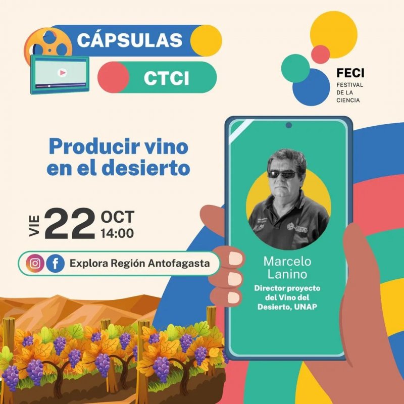 Cómo parte de las actividades de FECI 2021 la Universidad Arturo Prat presentó la cápsula audiovisual de relato científico del investigador Marcelo Lanino, director del proyecto Vino del Desierto, denominada ‘’Producir vino en el desierto”, la cual fue difundida a través de distintas redes sociales . Asimismo se realizó un conversatorio on line transmitido a través del medio digital Timeline denominado “Ciencia e Innovación en el Norte del País”, instancia que contó con la participación de los investigadores José Delatorre, José Olave, Erico Carmona y Juan Pablo Díaz quiénes expusieron sobre los principales resultados de los proyectos FIC R que desarrollan en la macrozona norte del país relacionados con temas tales como : biorremediación de suelos, biodiversidad, recursos hídricos, plantas endémicas etc.