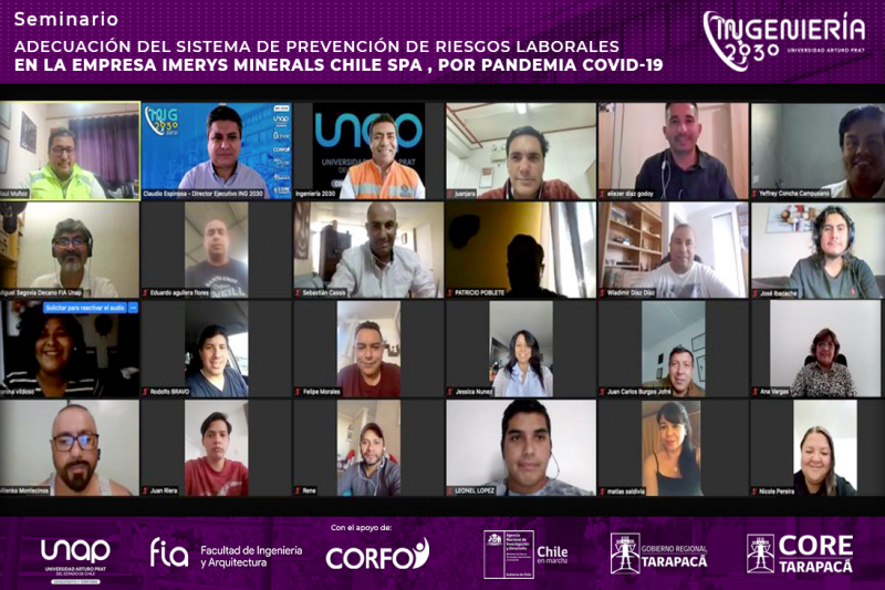 Desde la Planta Industrial IMERYS, de la Región de Arica y Parinacota, se realizó el seminario de SSO denominado “Adecuación del Sistema de Prevención de Riesgos Laborales en la Empresa IMERYS MINERALS CHILE SPA, por PANDEMIA COVID-19”. La iniciativa fue encabezada y organizada por Belfor Vilca Astorga Académico y Jefe Carrera de IEPR, estudiantes de la promoción 2020 y por el Gerente de Planta Imerys, Raúl Muñoz Palza. Las palabras iniciales estuvieron a cargo del Decano de la FIA Miguel Segovia Rivera, y las de cierre y agradecimientos a cargo de la Estudiante Yanina Vildoso de la promoción 2020.