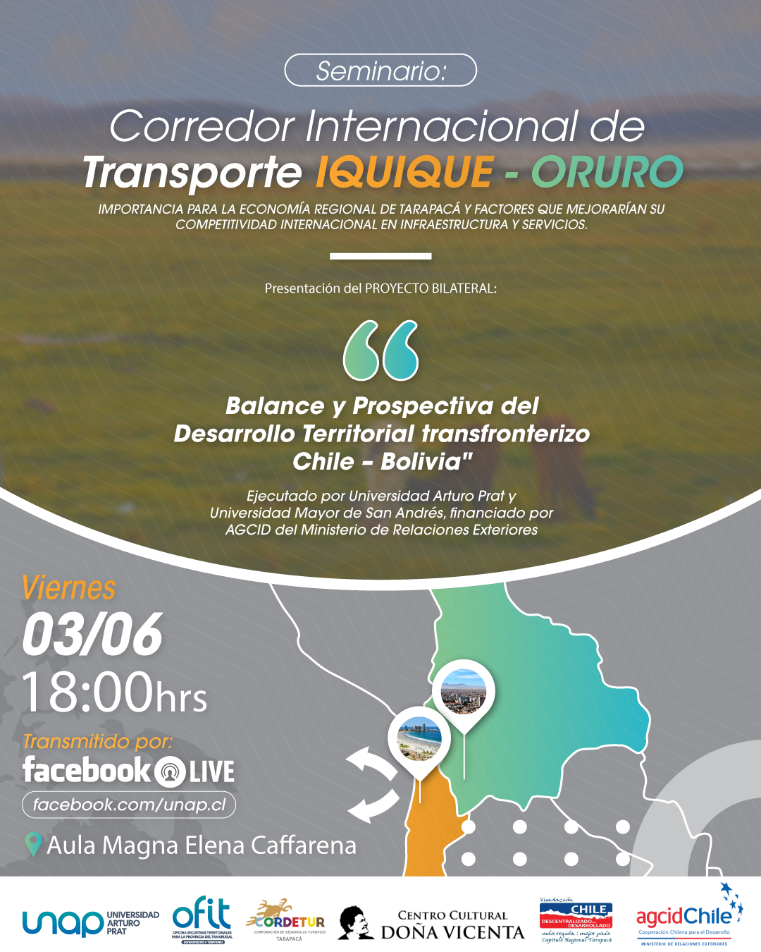 La Universidad Arturo Prat (UNAP), junto a la Corporación para el Desarrollo del Turismo y Conservación del Patrimonio de la Región de Tarapacá, (CORDETUR), el Centro Cultural Doña Vicenta y el Capítulo Regional Chile Descentralizado, invita a participar en el Seminario “Corredor Internacional de Transporte Iquique-Oruro”.