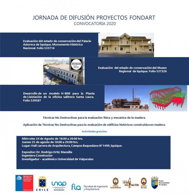 El Dr. Rodrigo Ortiz Mancilla, ingeniero constructor y académico de la Escuela de Construcción Civil de la Universidad de Valparaíso, será quien expondrá los proyectos del Fondo Nacional de Desarrollo Cultural y las Artes (FONDART) que ejecuta en Tarapacá y que le permitieron evaluar el estado de conservación del Palacio Astoreca y del Museo Regional de Iquique; así como desarrollar un modelo H-BIM (maqueta virtual) para la planta de lixiviación de la ex oficina salitrera Santa Laura.