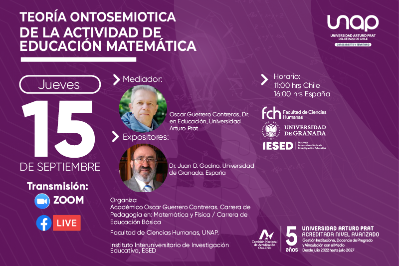 El próximo jueves 15 de septiembre, el destacado matemático e investigador español Dr. Juan D. Godino dictará la videoconferencia “Teoría ontosemiótica de la actividad de educación matemática”, una iniciativa organizada por la Facultad de Ciencias Humanas de la Universidad Arturo Prat (UNAP).