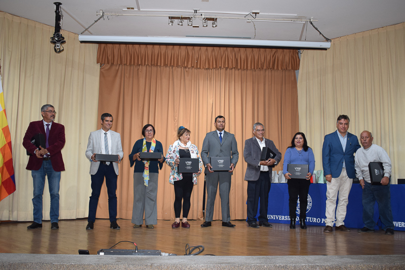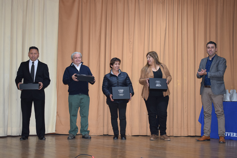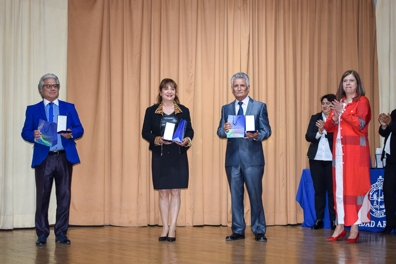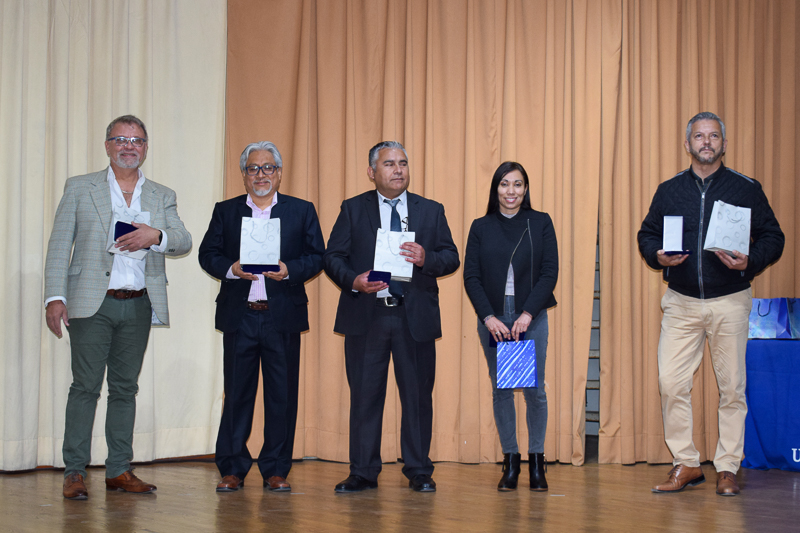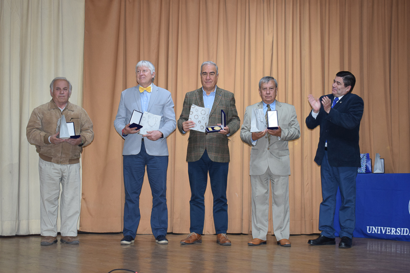 Pedro Oyarzún Ilabaca, ex académico del Departamento de Economía y Administración; Jorge Tapia Valdés, ex director del Instituto de Estudios Internacionales; Manuel Lara Plascencio, ex jefe de personal y jefe de Recursos Humanos; Fredi Veas Marín, ex Presidente de la Junta Directiva y académico; Carlos Bruna Rojas, ex supervisor de auxiliares; Olga Astorga Glasinovic ex secretaria del Departamento de Auditoría y Sistemas de Información; Julio Miranda Lillo, ex rector y académico y finalmente, Luis Alfaro Rodríguez, (nuestro recordado Lolo), ex funcionario de la oficina de partes. A ellas y ellos nuestra gratitud por todo lo que nos entregaron. Pido por favor, un gran y caluroso aplauso para ellas y ellos".