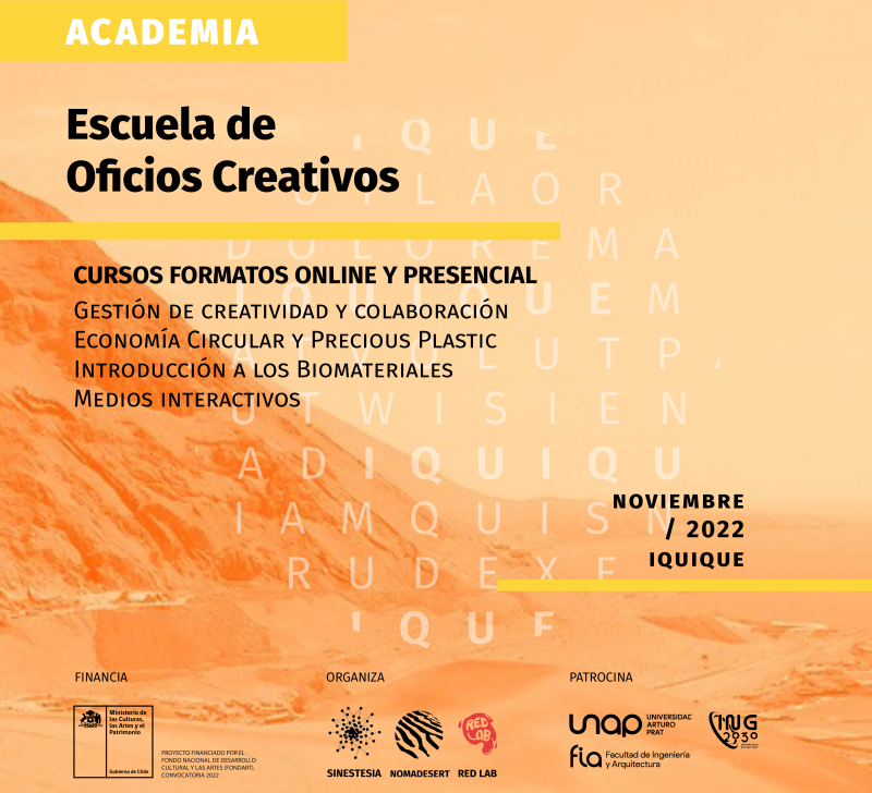 “Gestión de creatividad y colaboración”, “Medios interactivos”, “Introducción a los biomateriales” y “Economía circular y precious plastic” son los cuatro cursos gratuitos que la Escuela de Oficios Creativos impartirá durante noviembre próximo en la región de Tarapacá con el objetivo de formar y fortalecer el ecosistema creativo local.
