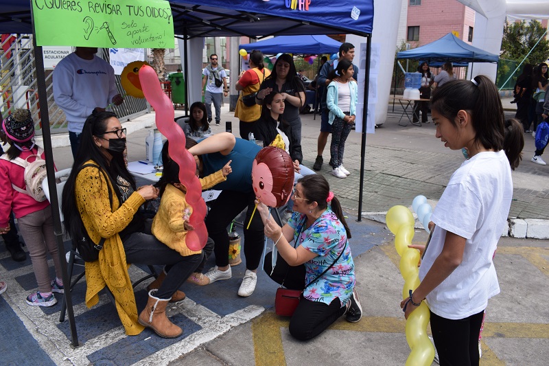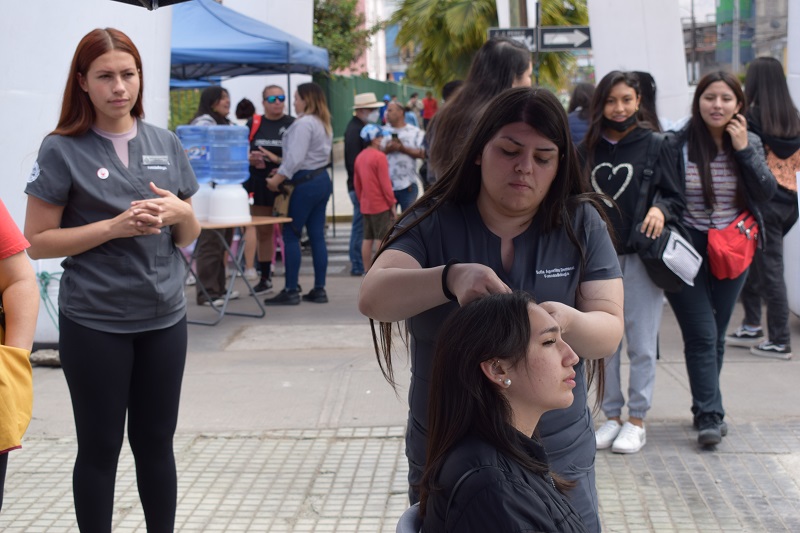 La carrera de Fonoaudiología efectuó otoscopias o exámenes de oídos a decenas de personas de todas las edades, entregando recomendaciones para el cuidado de la salud. Las y los estudiantes organizaron además la “trenzatón”, ofreciendo peinados. En tanto, la carrera de Enfermería realizó controles de presión arterial, también dando orientaciones saludables. Ambas actividades fueron guiadas por docentes de las respectivas especialidades de la salud.