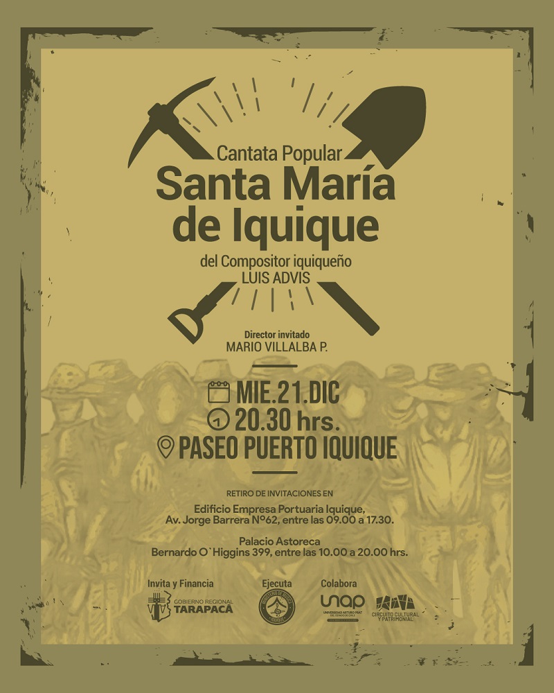 La cantata —compuesta en 1969 por el músico iquiqueño Luis Advis Vitaglich (1935-2004)— se ofrecerá de manera gratuita en edificio del Paseo Peatonal de la Empresa Portuaria (EPI). La actividad es financiada por el Gobierno Regional de Tarapacá, con la colaboración de la UNAP, a través de su proyecto Circuito Cultural y Patrimonial.