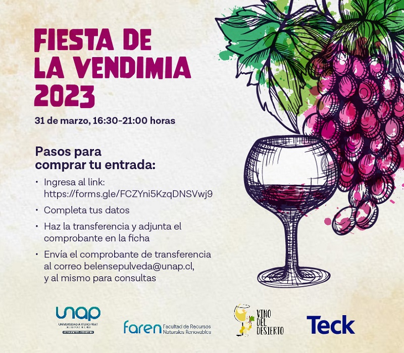 La vendimia es la cosecha de las uvas, representa el término de la primera etapa en viñedo, para dar paso al proceso de la obtención de vino. En ese aspecto y como cada año, la Fiesta de la Vendimia 2023 (N° XVIII), es uno de los eventos más esperados por las y los amantes del vino y la gastronomía. Y, por ende, la Universidad Arturo Prat (UNAP) realizará la actividad el viernes 31 de marzo en la Viña Canchones, ubicada en la Estación Experimental, localidad de la Huayca, Provincia del Tamarugal.