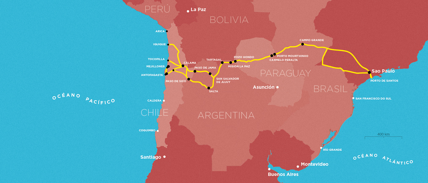 El corredor se proyecta desde la costa de Brasil, cruzando por los territorios de Paraguay y Argentina, hasta alcanzar los puertos del norte de Chile. Se consideran las carreteras, puertos, aeropuertos, ferrovías e hidrovías junto a las plataformas logísticas, conformando el eje de integración y desarrollo que vinculan a las cuatro economías para mejorar la competitividad de los productos en mercados de Asia-Pacifico y Europa.