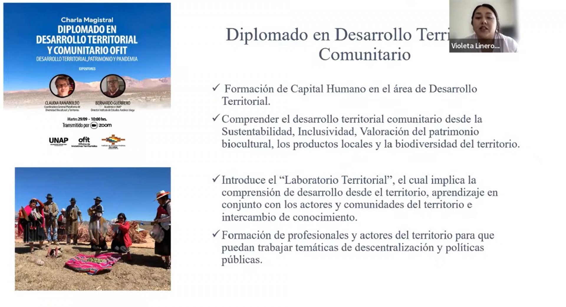 Vía online, Violeta Lineros señaló que el objetivo principal de la OFIIT —proyecto financiado con recursos del Ministerio de Educación— es impulsar el desarrollo regional integral, sostenible y con identidad en la Región de Tarapacá, a través de capacitaciones y asesorías a emprendimientos e iniciativas que favorecen a las comunidades. Asimismo, busca articular y gestionar potencialidades del territorio, así como también reconocer sus debilidades para aportar soluciones.