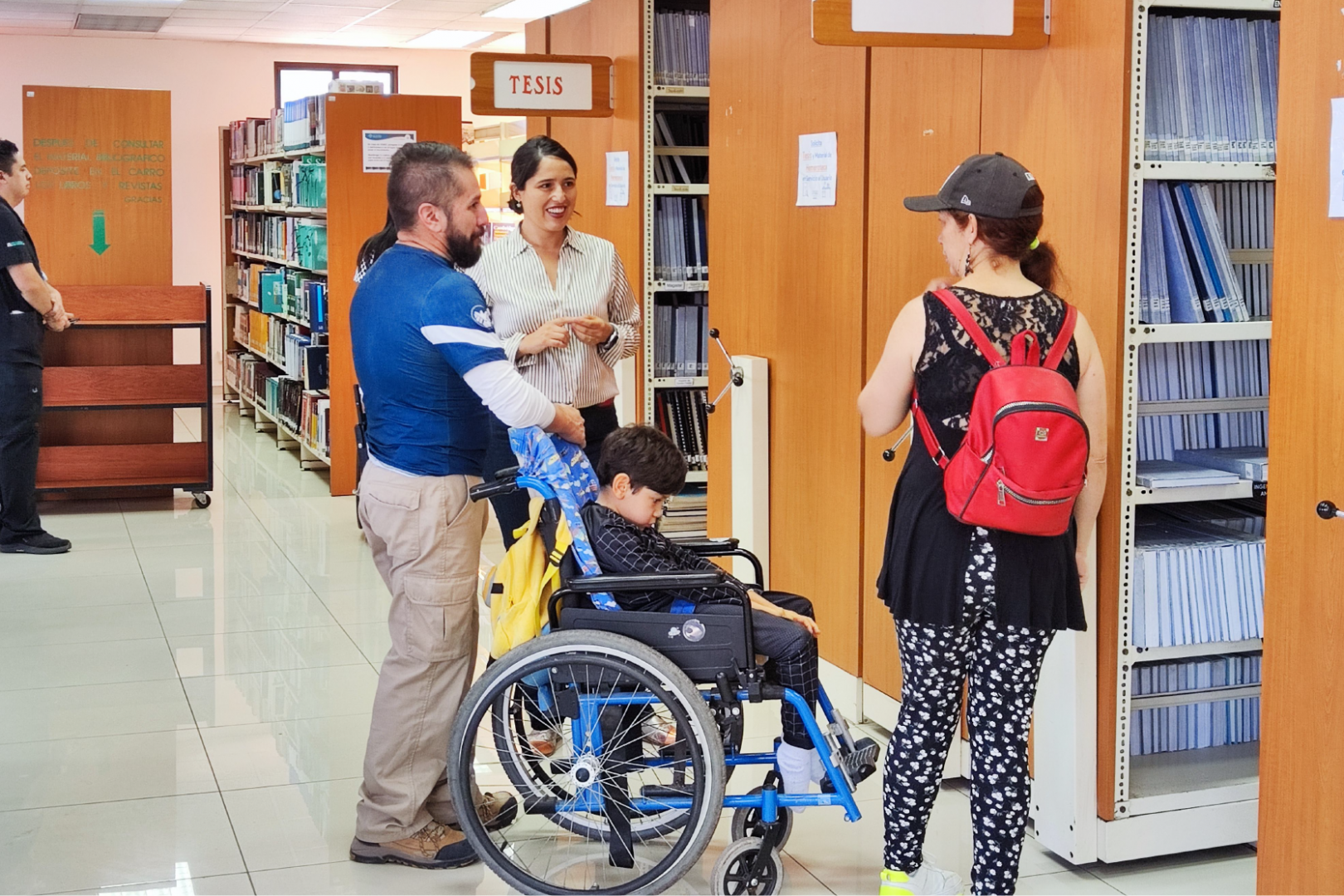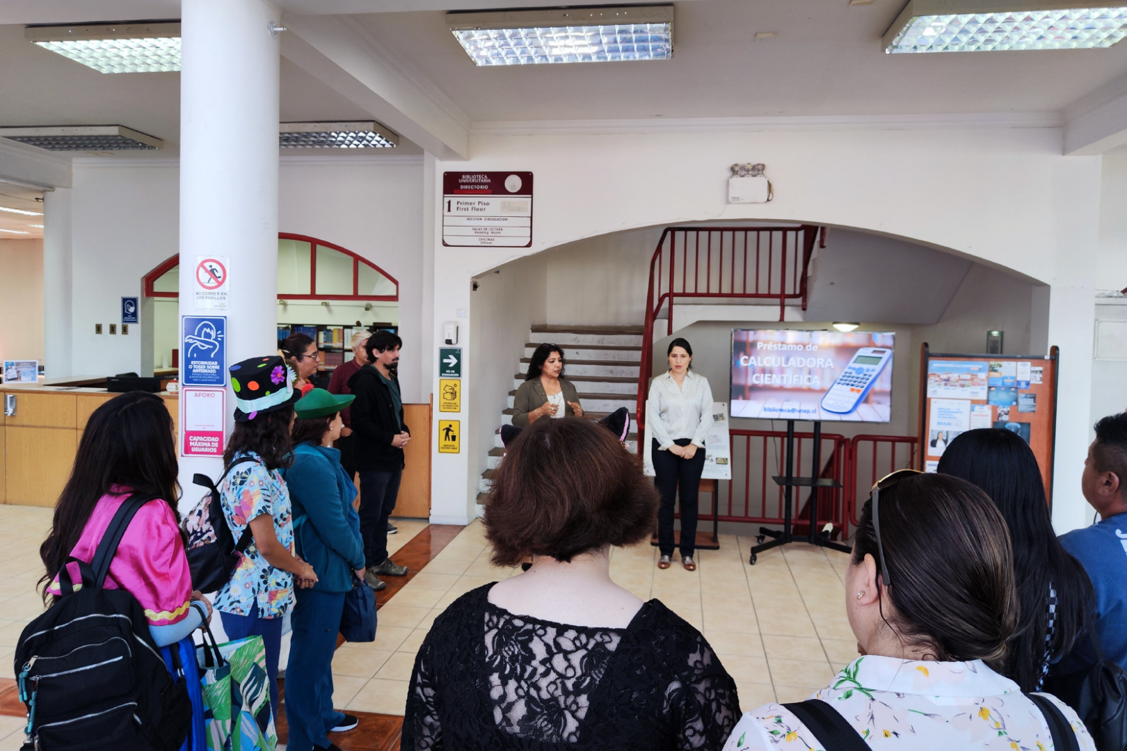 El recorrido contempló una pequeña introducción al proceso de digitalización de libros, la visita a las distintas secciones, tanto de atención de usuarios como administrativas, como así también estanterías, espacios de estudio y lo que es el proceso desde que ingresa un libro a biblioteca hasta su puesta en estantería.