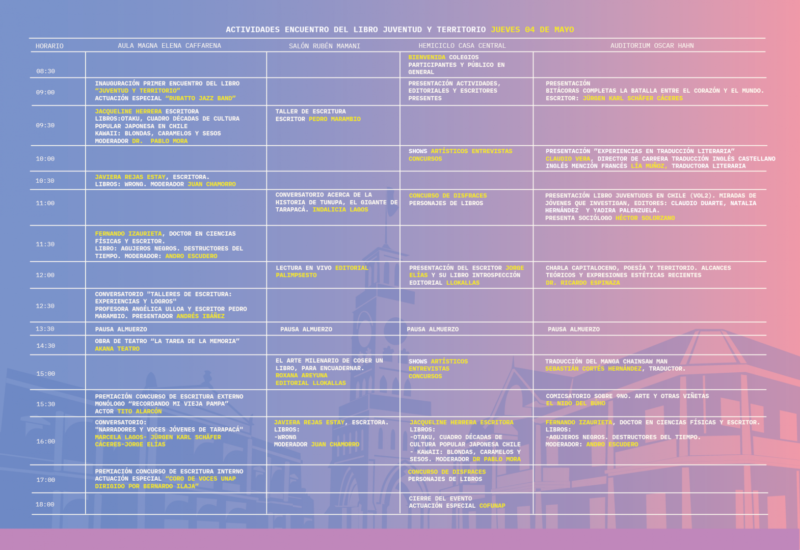 La actividad, que se llevará a cabo en distintas dependencias de la Universidad Arturo Prat (UNAP), es organizada por la Facultad de Ciencias Humanas, el Proyecto de Fortalecimiento Circuito Escolar y el proyecto Circuito Cultural, ambos dependientes de la Dirección General de Vinculación y Relaciones Internacionales de esta Casa Estudios Superiores.