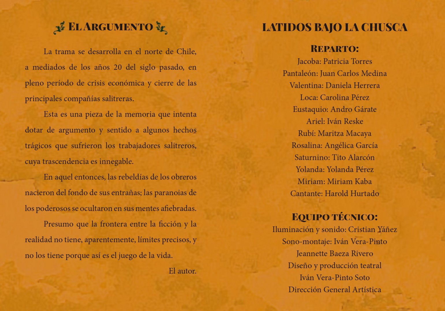 En esta historia se retrata las acciones mancomunadas de los obreros para defender sus intereses, procurar mejores condiciones de trabajo y sortear la cesantía desatada a consecuencia de la suspensión de las actividades mineras en el norte grande. Paralelamente, se descubren las diferencias sociales y los conflictos que tenían tanto la masa de asalariados, como los dueños de las factorías. El misterio, la intriga, el crimen y el amor son los principales ingredientes que envuelve a una propuesta escénica que no dejará indiferente a nadie, por su contenido identitario y la “puesta en escena”.