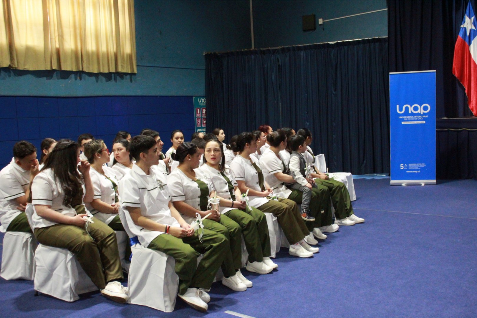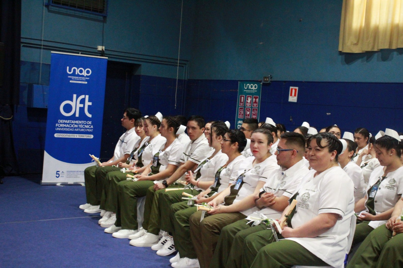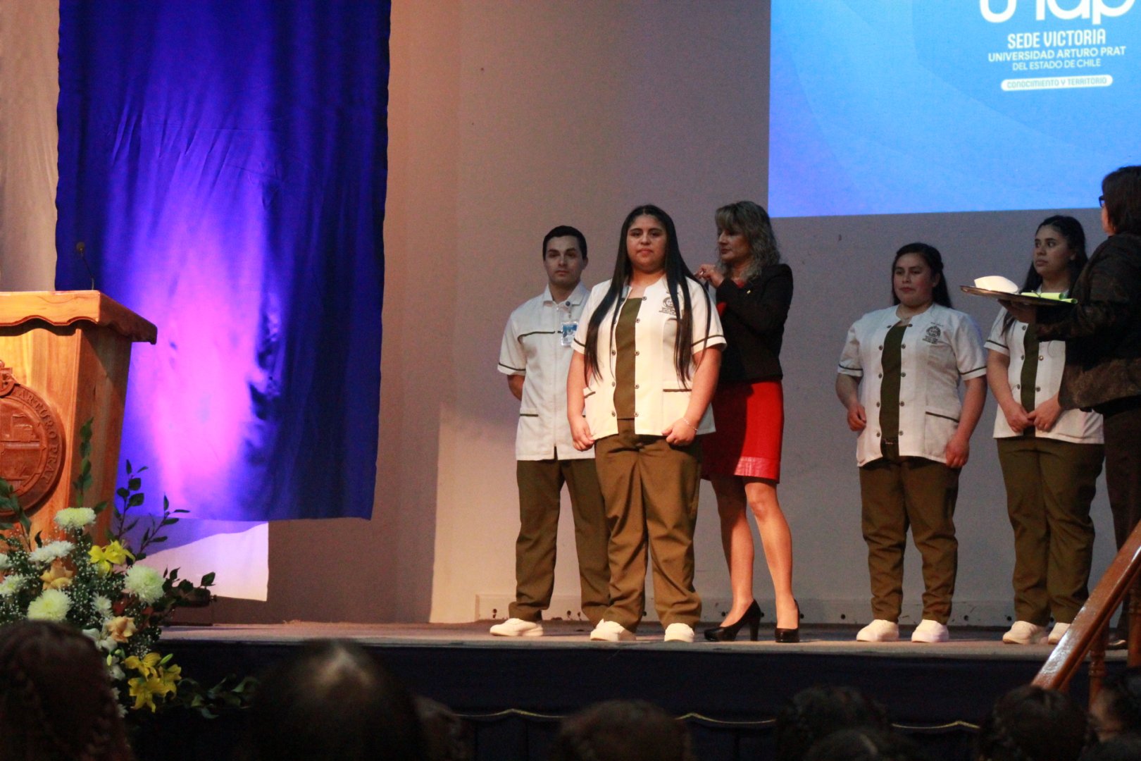Con el propósito continuar con la tradición, y de saldar la deuda con la Admisión 2021, un total de 120 estudiantes de Técnico de Nivel Superior (TNS) en Enfermería tuvieron su anhelada Ceremonia de Investidura en la Universidad Arturo Prat Sede Victoria; siendo una muy especial actividad efectuada en dos bloques, con los TNS de último año recibiendo los símbolos de su especialidad durante la mañana.