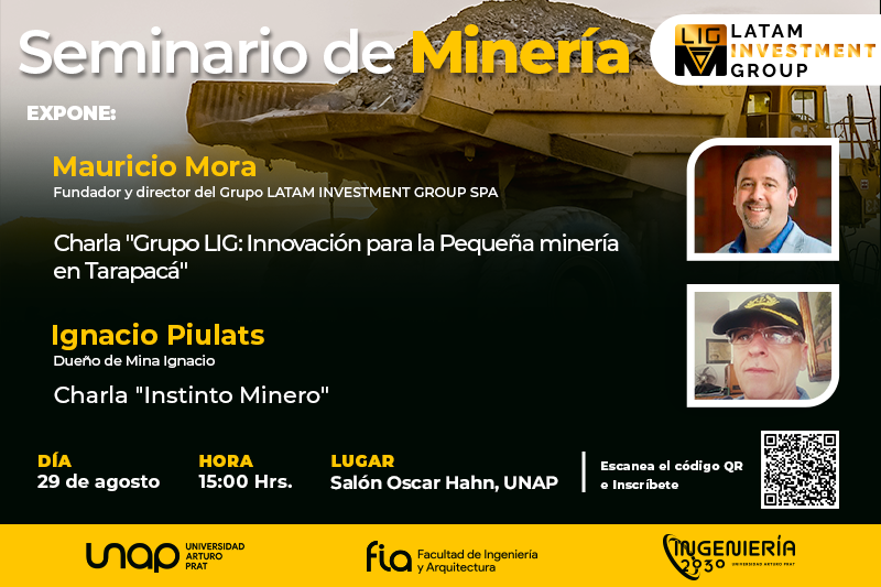 La Facultad de Ingeniería y Arquitectura de la Universidad Arturo Prat, en conjunto al programa Nueva ING2030, realizará el Seminario de Minería centrado principalmente en la pequeña minería. El evento se realizará el 29 de agosto a las 15.00 hrs., en el Salón Oscar Hahn, ubicado en las dependencias de la UNAP.