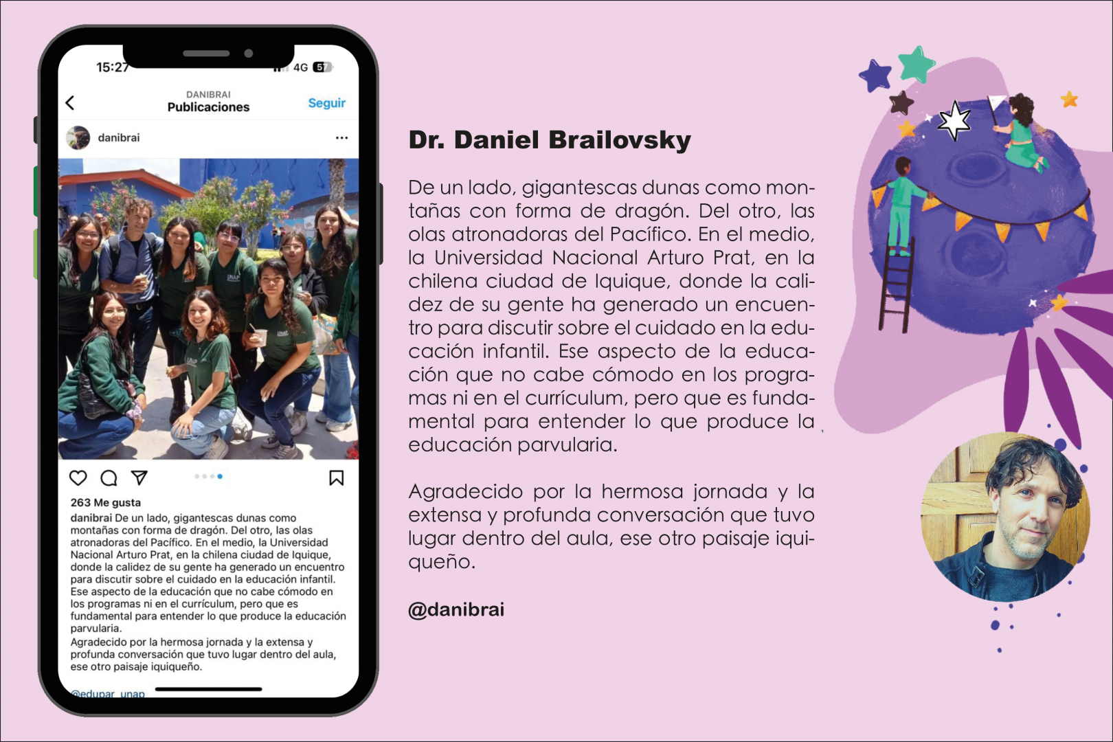 En el Aula Magna de la Universidad Arturo Prat (UNAP), la carrera de Educación Parvularia con mención en educación inclusiva realizó el seminario titulado “Cuidar el mundo: contacto infantil resignificando el buen trato en educación”, desarrollado por Daniel Brailovsky, Doctor en Educación, con amplia trayectoria como formador docente y escritor de numerosos libros sobre pedagogía, didáctica y educación infantil. El seminarios abordó la importancia de la educación inicial y la necesidad de una asistencia permanente para las niñeces.