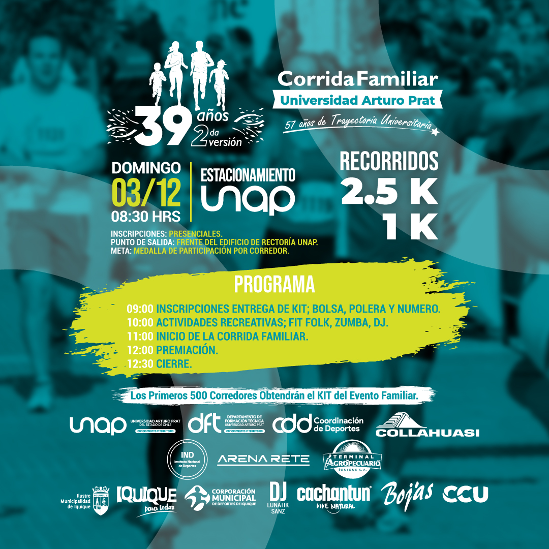 La Corrida Familiar —que tuvo la participación del rector de la UNAP, Alberto Martínez, integrantes de la casa de estudios y público en general— fue organizada por la Dirección de Asuntos Estudiantiles a través de su unidad de Coordinación de Deportes.