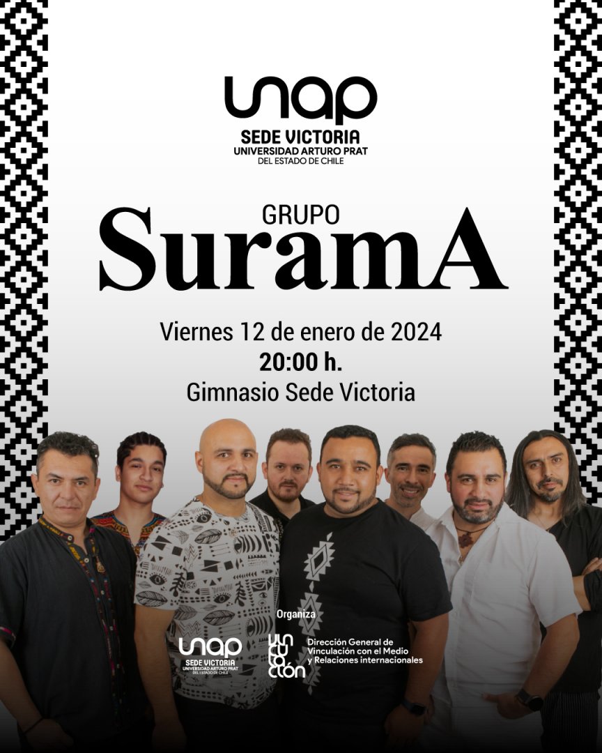 Pensada como un relevante punto de encuentro cultural para la comunidad, la conocida agrupación musical SuramA se encuentra afinando los últimos detalles para la que será su presentación en la Universidad Arturo Prat Sede Victoria, programada para este viernes 12 de enero a las 20 horas, en el Gimnasio de la Casa de Estudios Superiores.