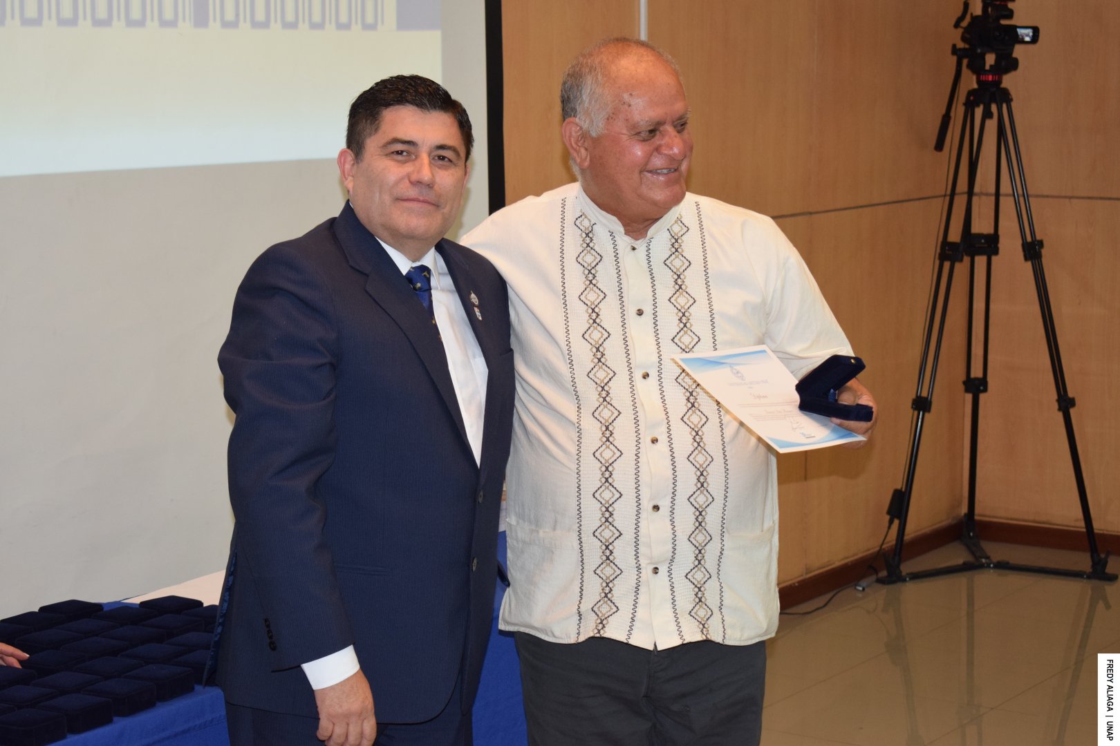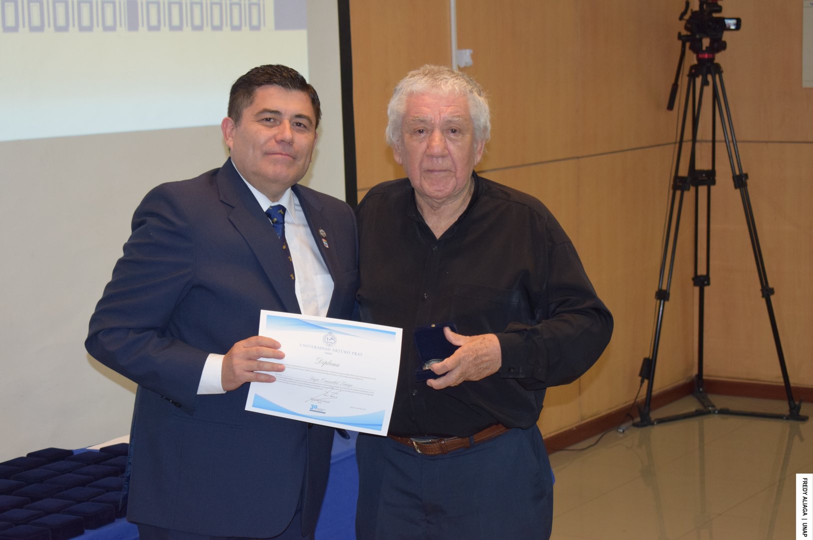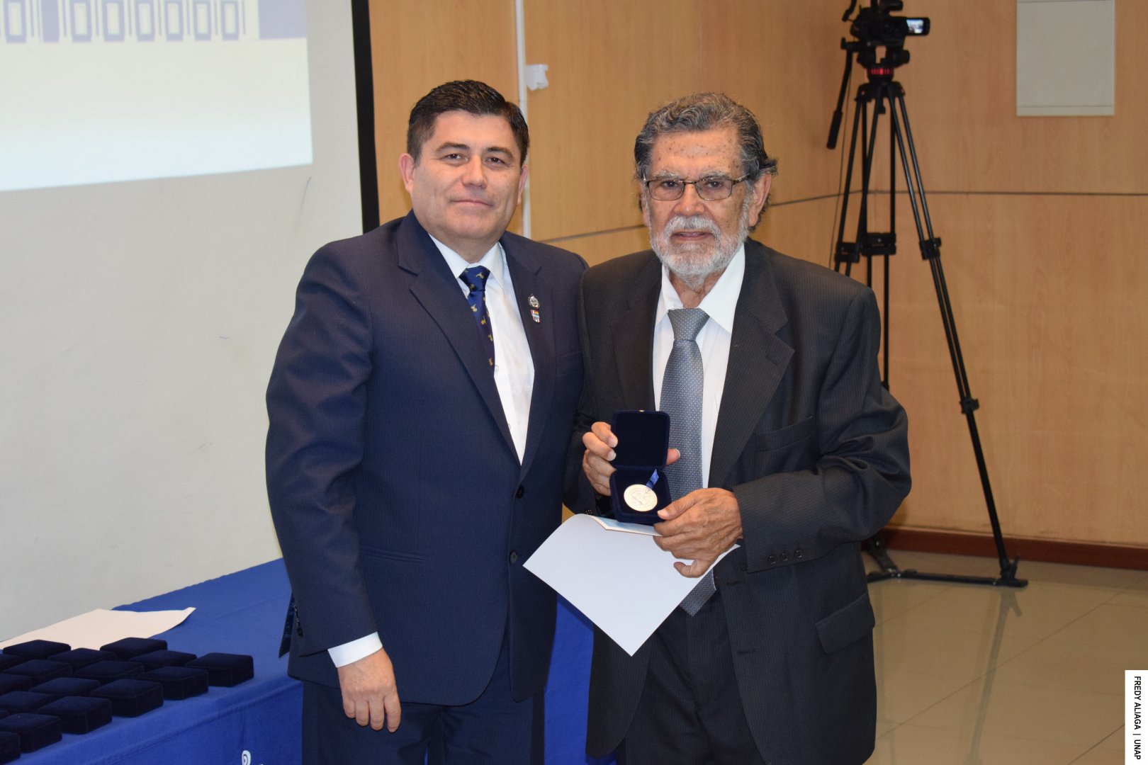 Además, como una manera de testimoniar y reconocer institucionalmente lo ocurrido y que afectó las vidas de cada víctima, la UNAP realizó otra emotiva ceremonia en la sala Óscar Hahn de la Casa Central, en Iquique. En la instancia, el rector entregó a cada afectado y afectada una medalla y un diploma de memoria histórica.