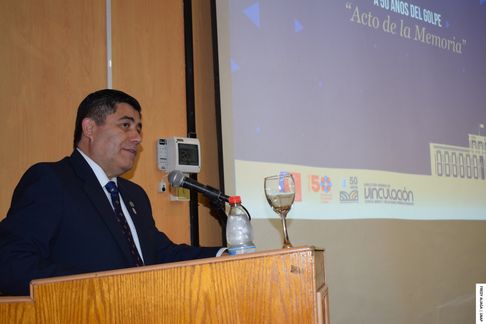 “Hemos querido reflexionar sobre estos funestos acontecimientos sucedidos hace 50 años en nuestro país, donde por medio del autoritarismo y la barbarie se instaló una dictadura cívico militar que tuvo funestas consecuencias en nuestro modelo republicano de sociedad. Como Universidad pública y regional, desde el primer día nos hicimos parte de este llamado a conmemorar y reflexionar, porque somos conscientes que preservar la memoria nos permitirá contribuir con nuestra misión esencial de formar ciudadanas y ciudadanos con pensamiento crítico. Y así promover el respeto irrestricto a la democracia y los derechos humanos, como valor cardinal en nuestras vidas”, aseguró Martínez Quezada.