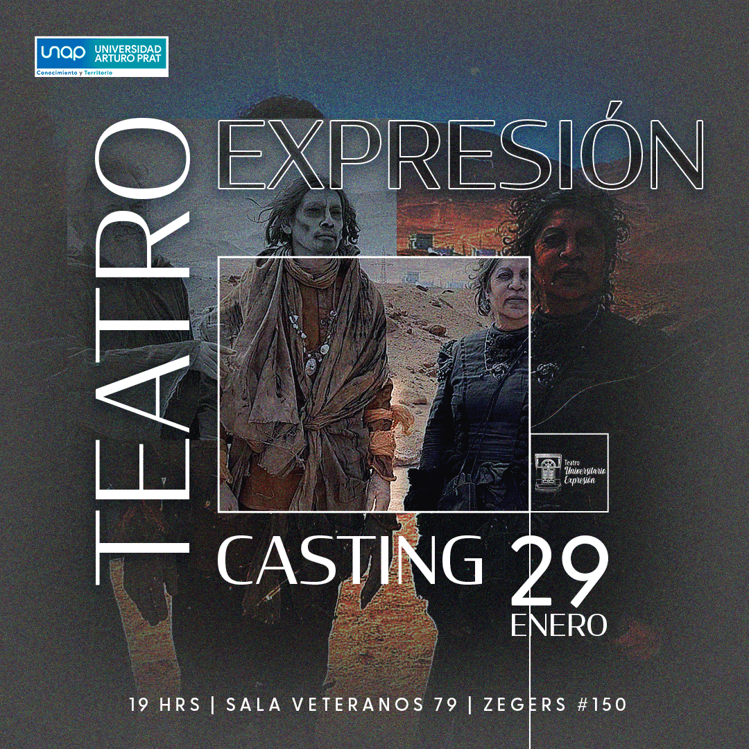 El Teatro Universitario Expresión, como parte de las actividades del “Proyecto Circuito Cultura Patrimonial” de la Dirección de Vinculación con el Medio de la Universidad Arturo Prat (UNAP), invita a todas las personas mayores de edad a participar en un casting que se llevará a cabo el día lunes 29 del presente mes a las 19:30 horas. El evento se realizará en la Sala Veteranos del 79, ubicada en la calle Zegers 150, siguiendo la tradición anual de inicio de año.
