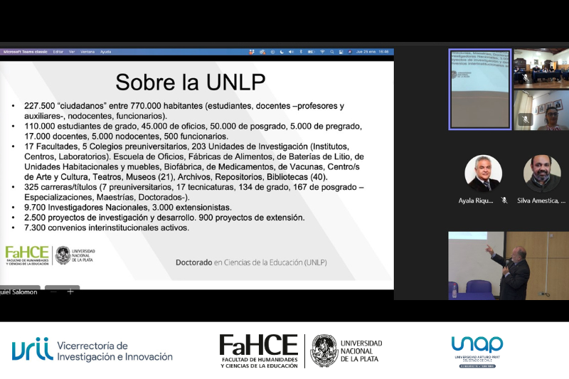 “Es un orgullo y un honor estar hoy en esta convocatoria, la que hemos ido construyendo juntos entre la UNLP y la UNAP, y que culminará con ustedes como doctoras y doctores en Ciencias de la Educación. Este proceso ha sido muy didáctico, hemos aprendido un montón. Poner el doctorado en marcha ha significado un proceso de afectividad institucional y normativa administrativa”, afirmó el académico.
