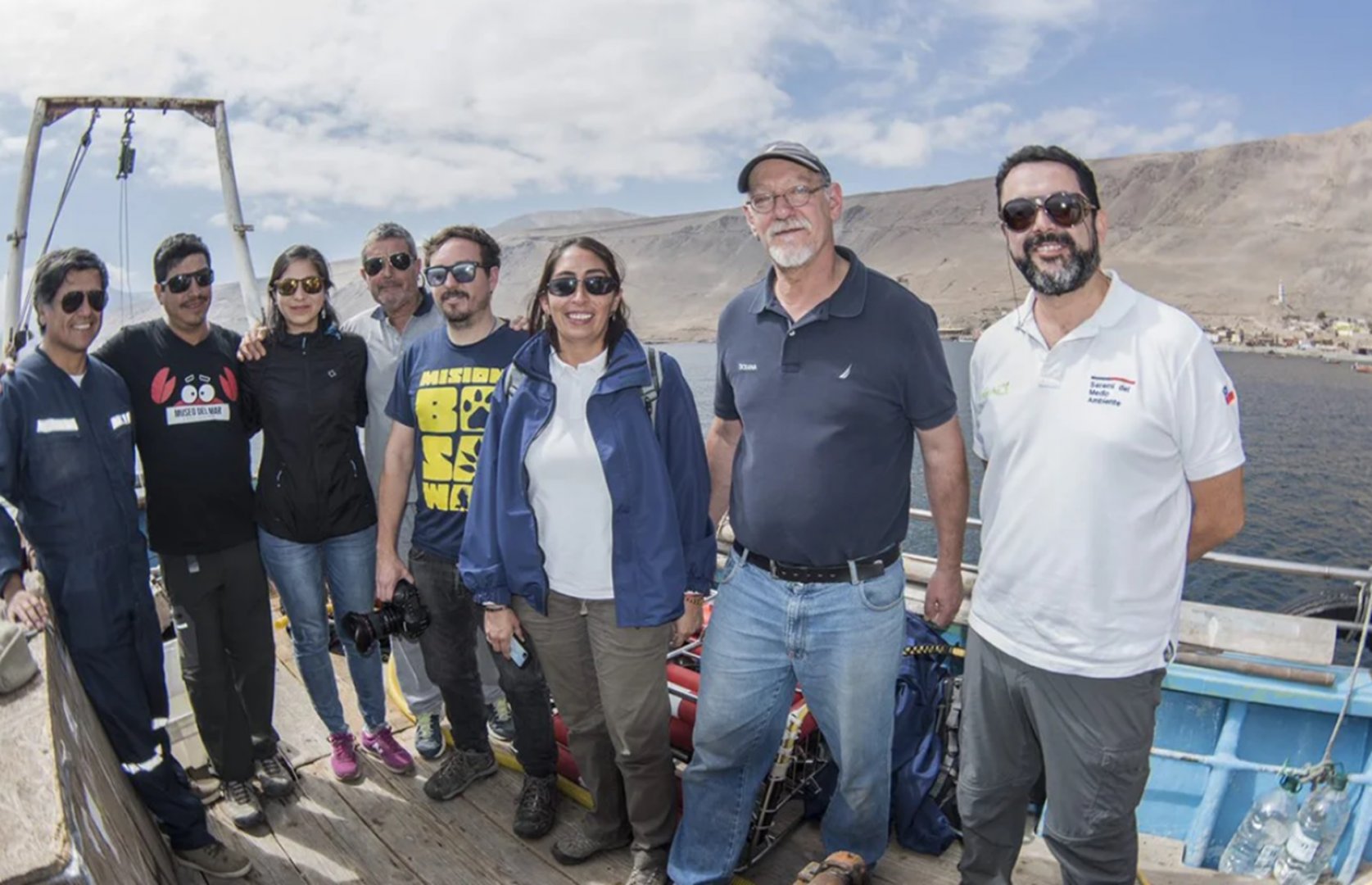 El Dr. Guillermo Guzmán (primero a la izquierda) junto a parte del equipo de investigadores e investigadoras quienes integraron las expediciones en el Mar de Pisagua organizadas por la ONG Oceana.