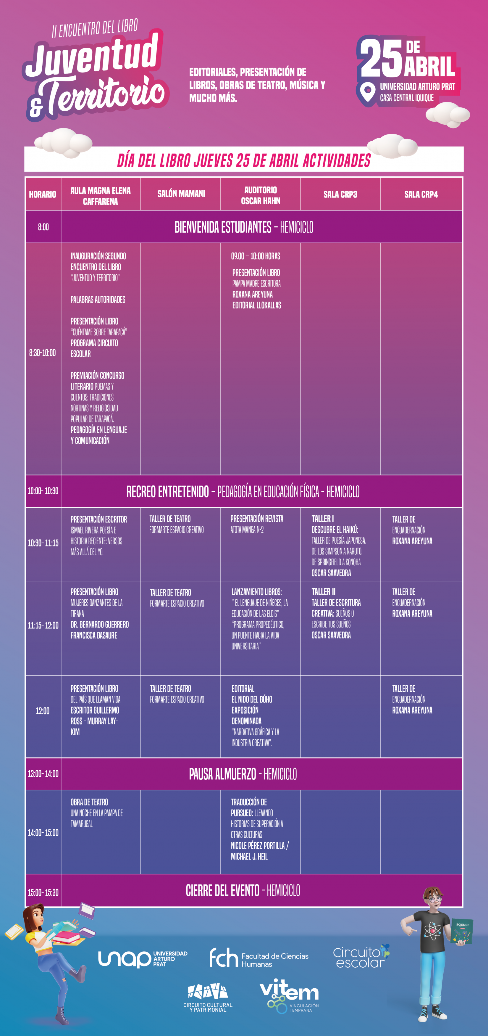 En un espacio para la lectura, la cultura y la educación se ha transformado el Encuentro “Juventud y Territorio”, iniciativa que ya lleva su segunda versión bajo el alero de la Dirección General de Vinculación con el Medio y Relaciones Internacionales (DGVRI) de la Universidad Arturo Prat (UNAP) y la Facultad de Ciencias Humanas de esta Casa de Estudios Superiores.