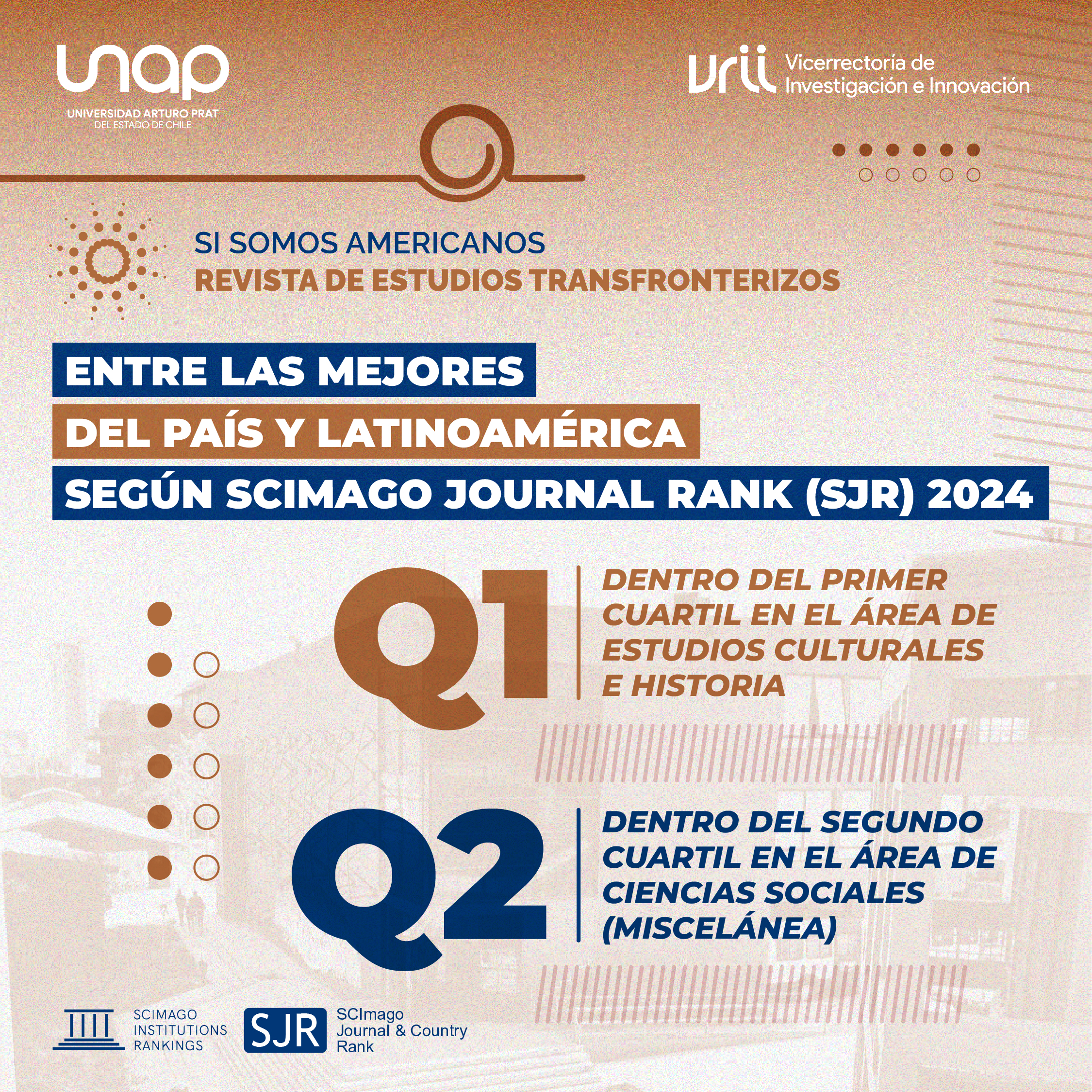 Si Somos Americanos. Revista de Estudios Transfronterizos (SSA), editada por el Instituto de Estudios Internacionales (INTE) de la Universidad Arturo Prat (UNAP), ha sido recientemente ubicada en el cuartil más alto (Q1) en las áreas de Estudios Culturales e Historia, y en el segundo cuartil (Q2) en el área de Ciencias Sociales (miscelánea), de acuerdo a la medición 2024 del SCImago Journal Rank (SJR), plataforma que provee indicadores sobre la calidad e impacto de publicaciones científicas a nivel global.