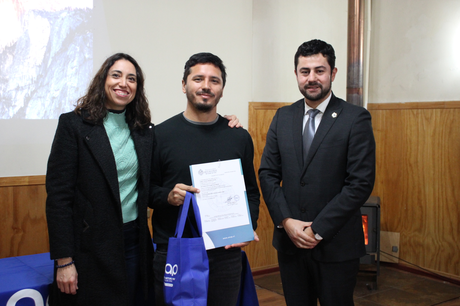 La actividad también estuvo centrada en otorgar reconocimientos a los nuevos universitarios, los que fueron entregados por Juan Pablo López y Marcela Rivadeneira a Romina Chain, Antropóloga proveniente de Córdoba, Argentina; Jerry Chacón, de nacionalidad venezolana y también Antropólogo; y el chileno Daniel Moreno, Historiador y Profesor de Historia, con diversos magísteres en historia e historia moderna, además de un Diplomado en Diversidad e Inclusión en la Educación Superior; por haber confiado en la propuesta de la UNAP para continuar con su formación de postgrado.