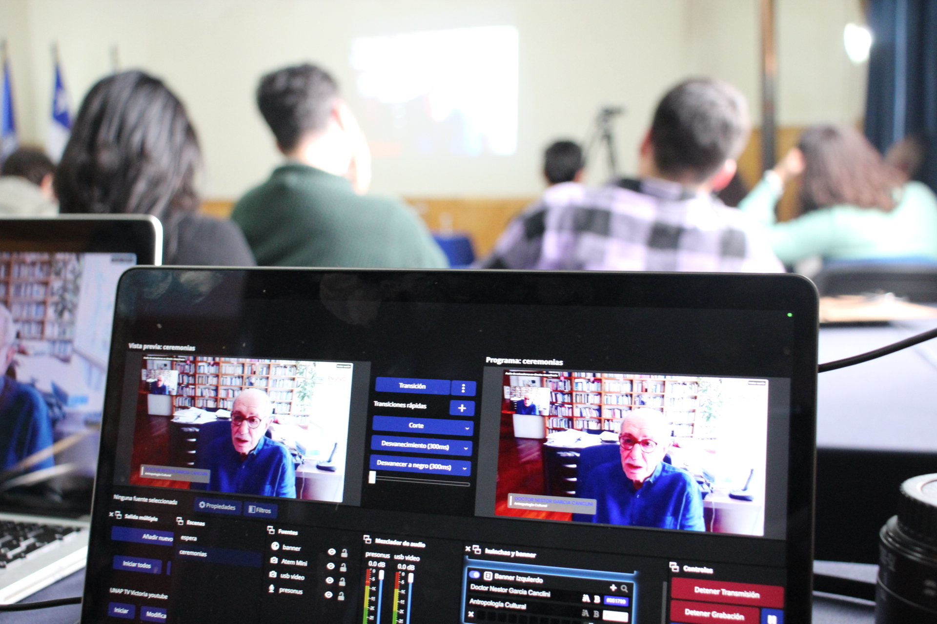 En cuanto al segundo bloque, realizado durante la tarde y presentado por el Dr. Saldívar, este estuvo enfocado en la clase magistral “Estudios culturales entre el territorio y el ambiente digital”, dictada vía videoconferencia desde México por el destacado Antropólogo, escritor, Profesor y crítico cultural de origen argentino, Dr. Néstor García Canclini, la que no solo fue exhibida en el Salón Auditorio, sino que además por la página de Facebook de la UNAP Sede Victoria, en donde reflexionó sobre la creación del DEC, haciendo un repaso histórico de los estudios culturales mundiales y latinoamericanos y sus principales características, entre otros tópicos; continuando con una extensa ronda de preguntas del público y finalizando la instancia con un claustro entre los alumnos del Doctorado y su correspondiente cuerpo académico.