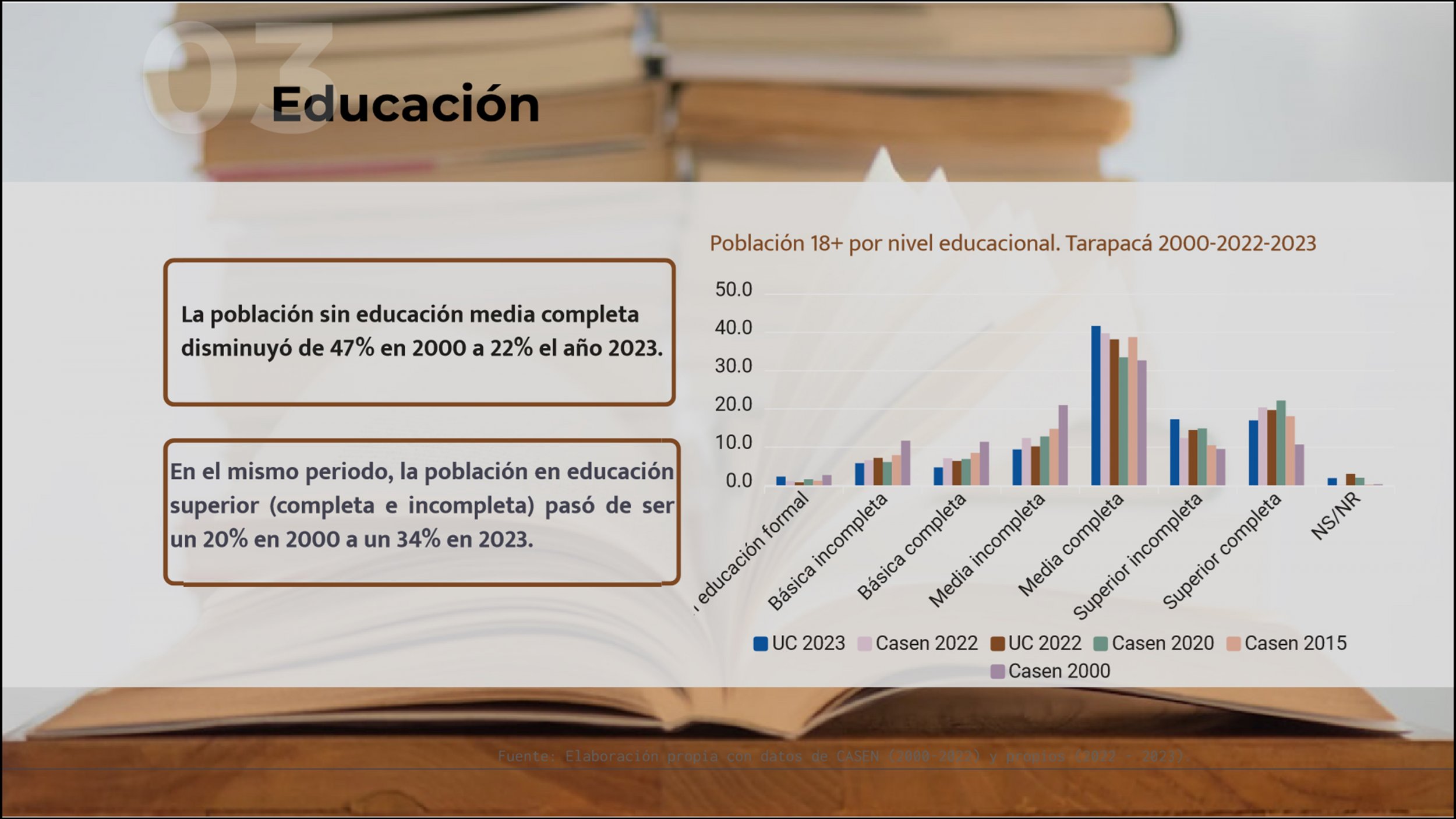 David Bravo, explicó que se evidenciaron avances entre la primera encuesta 2022 y la actual de 2023. Precisó que, en educación, aumentó la asistencia a establecimientos desde nivel parvulario hasta la educación superior, con una recuperación post pandemia no vista en otras 14 regiones. Además, bajó la pobreza respecto a 2022 y disminuyó la desigualdad de ingresos.