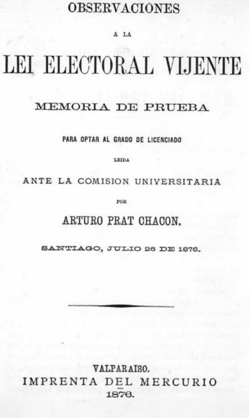 A sus 28 años de edad, días antes de su titulación como abogado, Arturo Prat presentó su tesis en la Universidad de Chile: "Observaciones a la Lei Electoral Vijente" (sic). El texto de 35 páginas, analizaba la Ley Electoral del año 1861, y su reforma de 1874, donde se ampliaba el número de personas con derecho a voto.