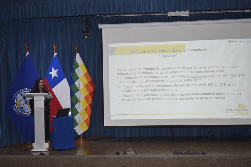 Al respecto Romina cisternas, jefe del departamento de Prevención Agencia Iquique de la Mutual de Seguridad, puntualizó que “Esto ha sido un desafío importante, pues si bien de acoso venimos hablando desde el 2005, hoy día recién se incorpora el tema de la violencia en el lugar de trabajo, y buscamos socializar la ley con las tipificaciones específicas para lo que es el mundo UNAP, que es un mundo público. Las leyes no están ajenas a lo que ustedes tienen que realizar como funcionarios, docentes y académicos, y lo que hemos hecho es difundir y generar conciencia, de tal manera que quien sufra de violencia o acoso tiene un responsable y como denunciante también tiene las opciones de que esto sea tratado, de que esto sea en estricta forma investigado, y que existan sanciones”.