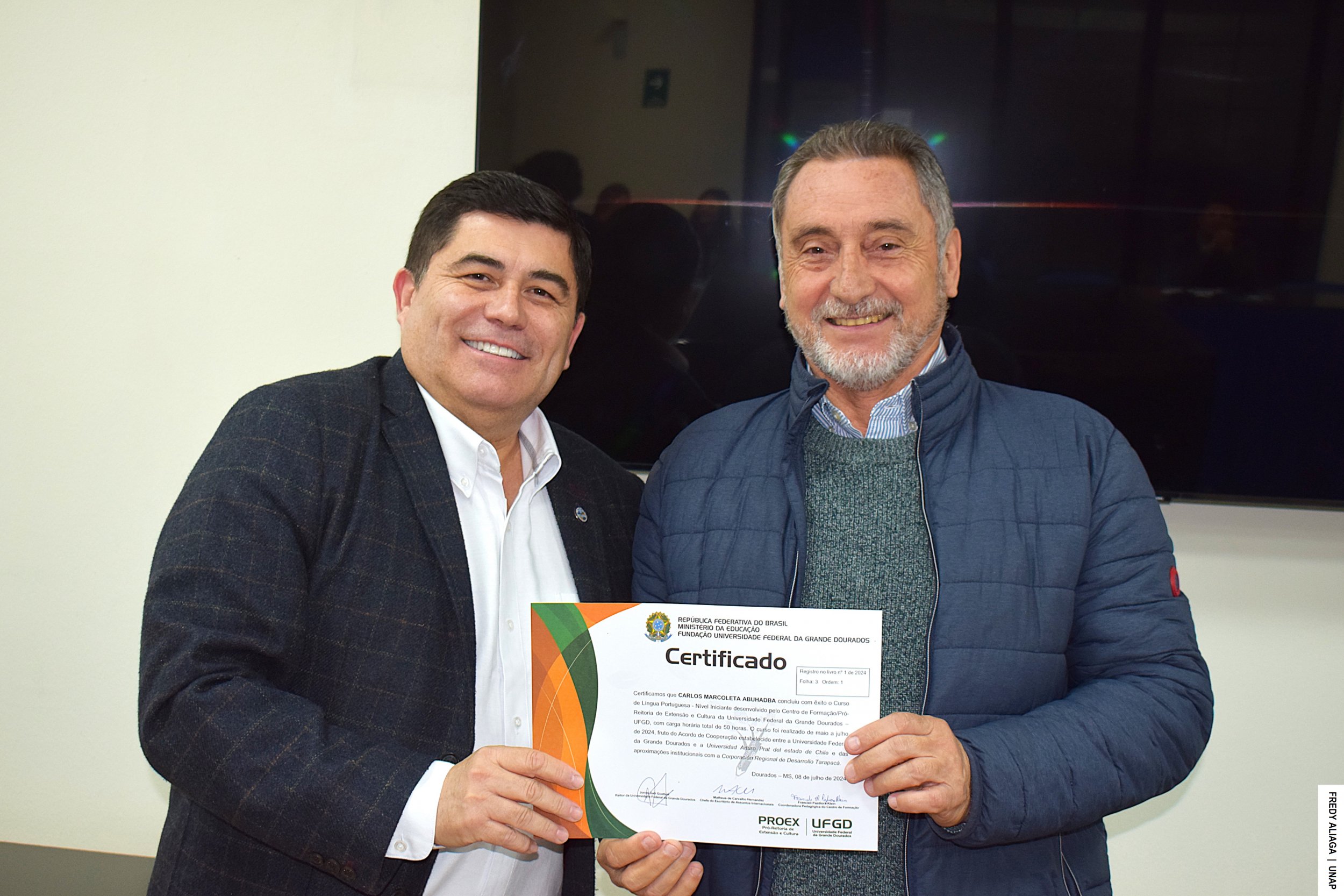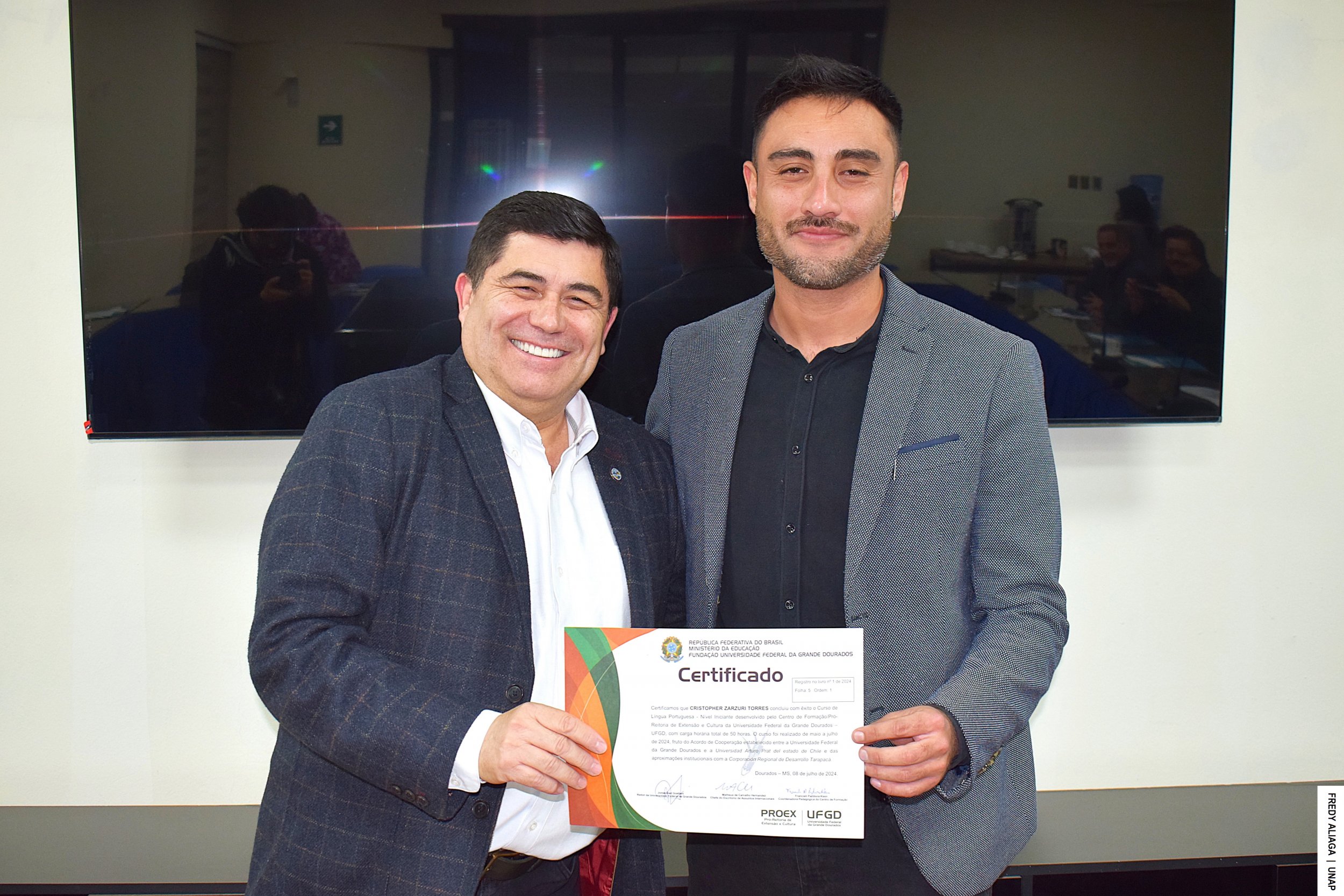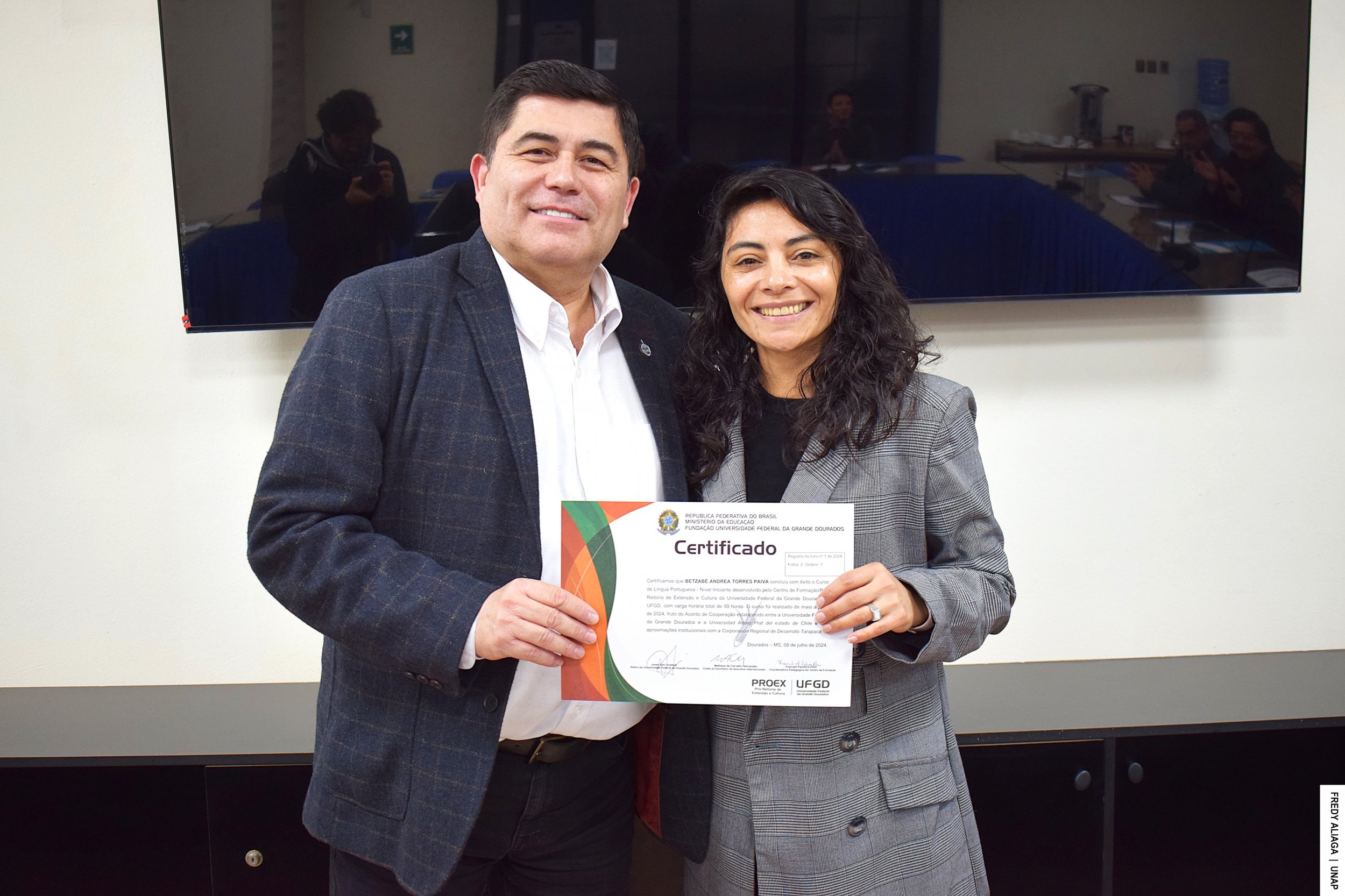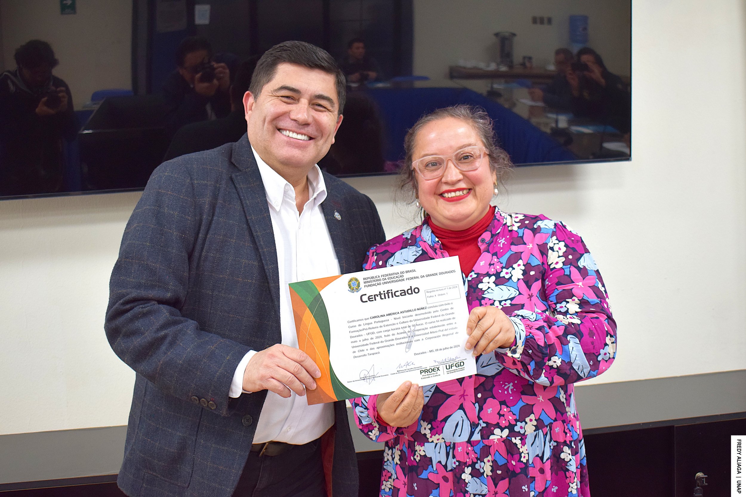 La ceremonia de certificación con cada participante del inédito curso se efectuó en la Casa Central de la UNAP, en Iquique, con la presencia del rector Alberto Martínez Quezada, actual presidente del Consejo de Rectores y Rectoras por la Integración de la Subregión Centro Oeste de Sudamérica (CRISCOS). También estuvo el asesor de internacionalización de la CRDT, Jaime Valenzuela Núñez.