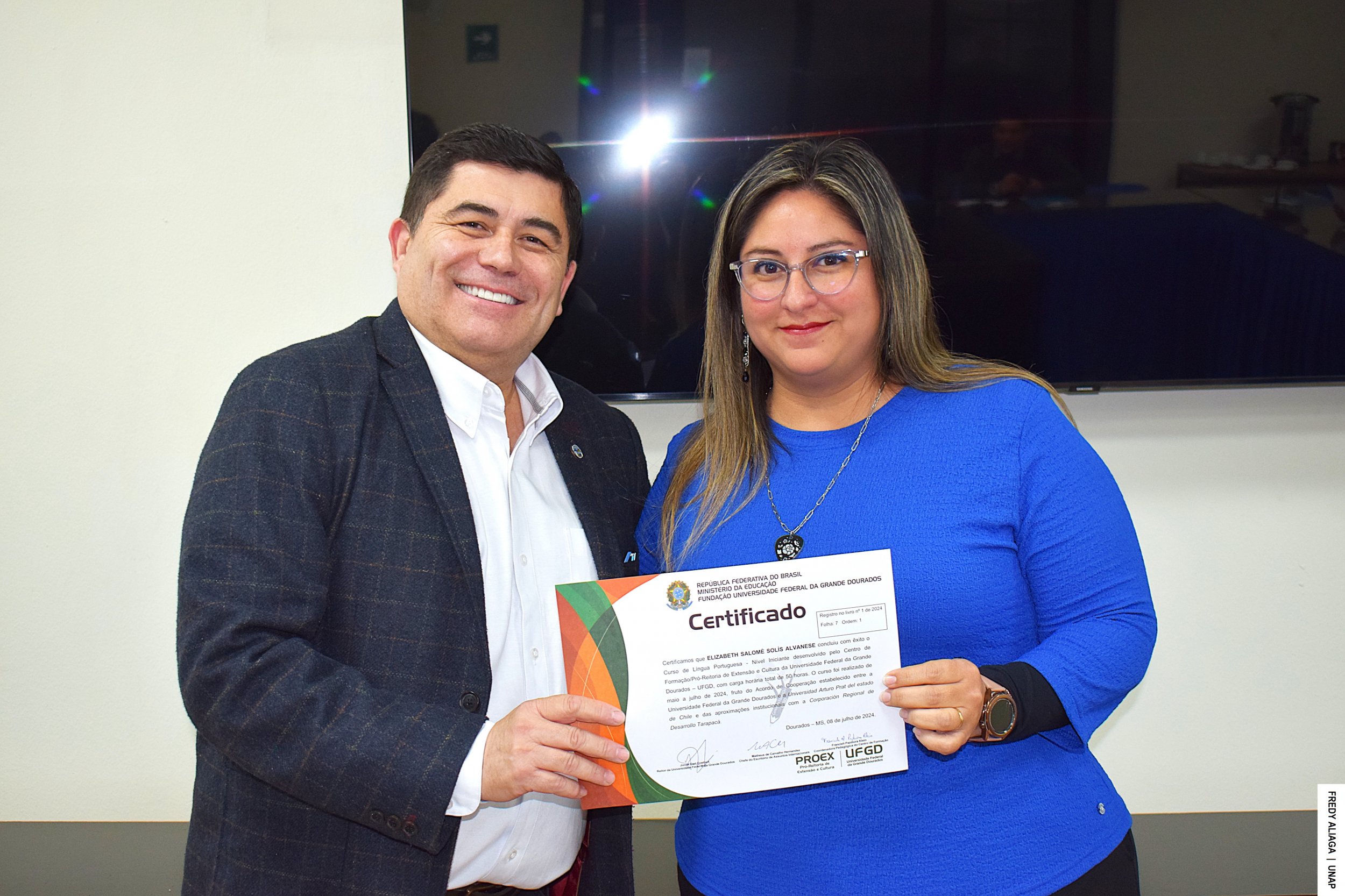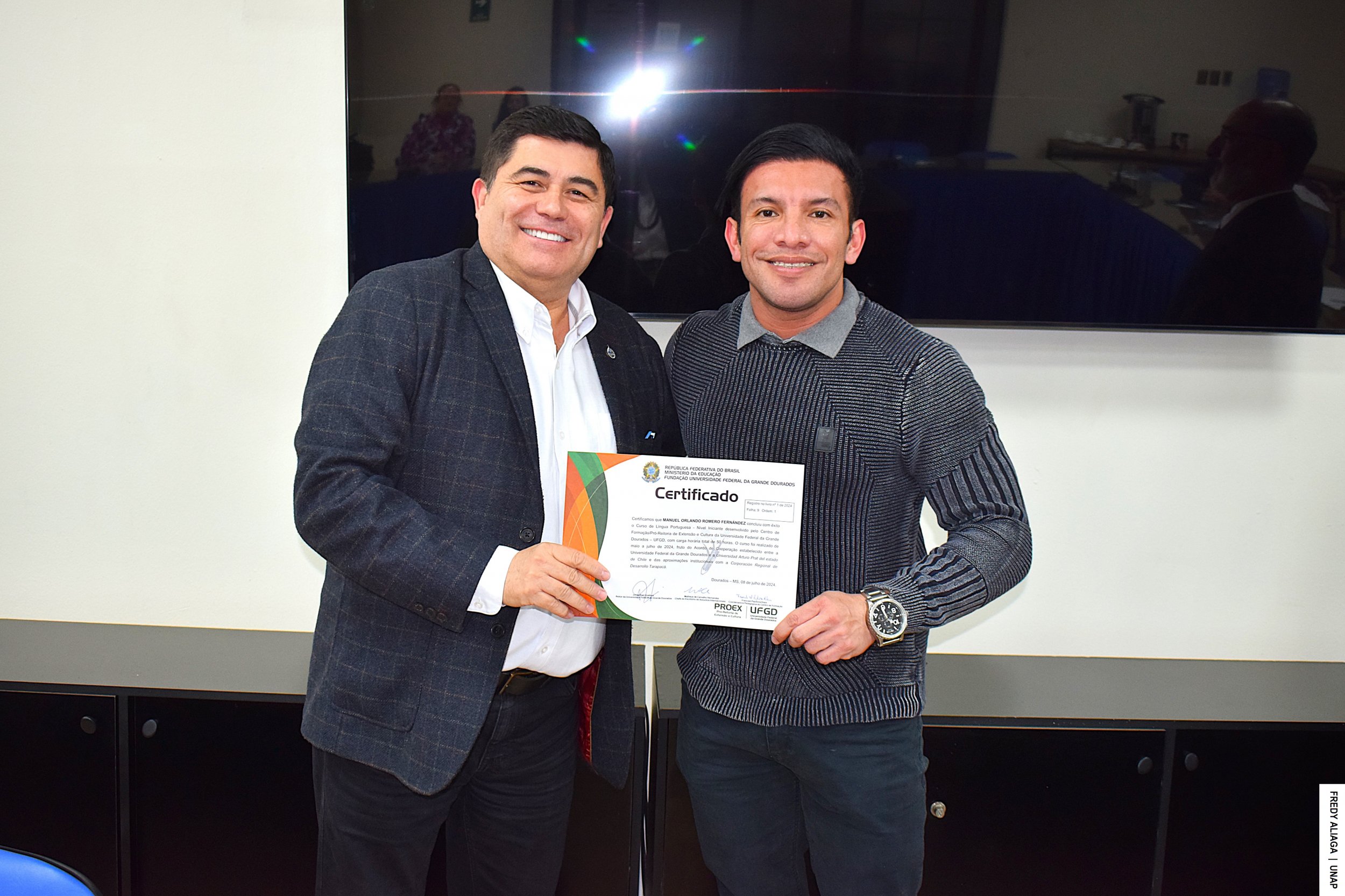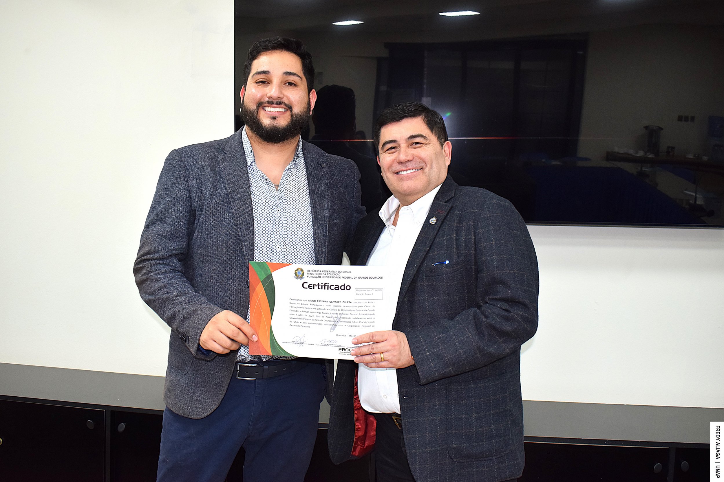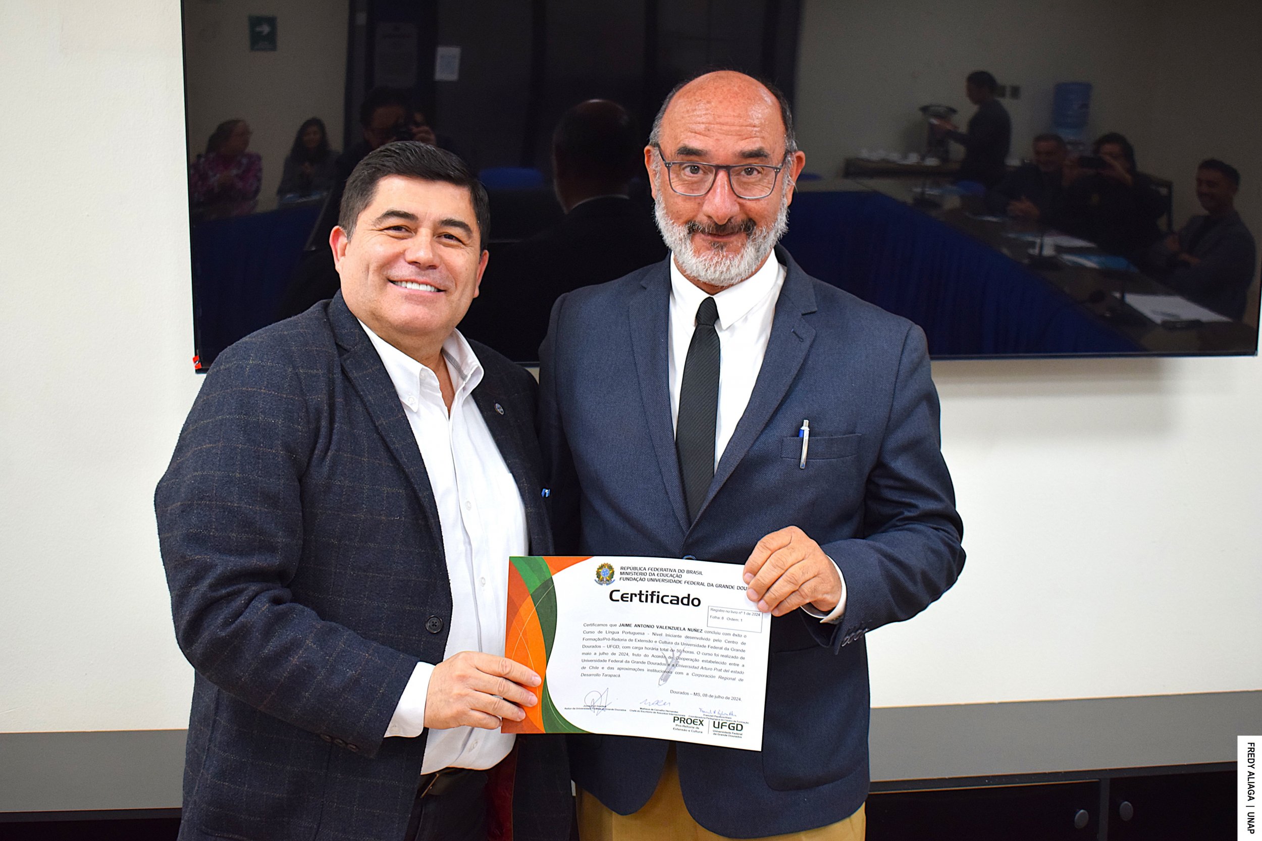 La ceremonia de certificación con cada participante del inédito curso se efectuó en la Casa Central de la UNAP, en Iquique, con la presencia del rector Alberto Martínez Quezada, actual presidente del Consejo de Rectores y Rectoras por la Integración de la Subregión Centro Oeste de Sudamérica (CRISCOS). También estuvo el asesor de internacionalización de la CRDT, Jaime Valenzuela Núñez.