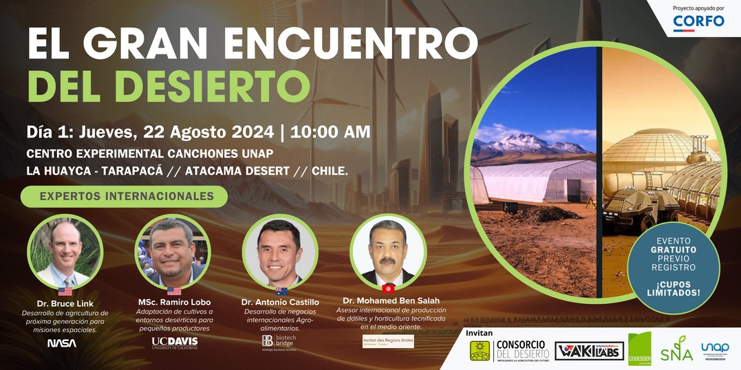 La iniciativa “Gran Encuentro de Agricultura del Desierto” reunirá al ecosistema de innovación y emprendimiento para examinar cómo el norte de Chile puede alcanzar un mayor desarrollo productivo, considerando sus características de clima extremo, intensa radiación solar, oscilaciones térmicas, escasez de recurso hídrico y su variedad ecológica. La actividad corresponde a un proyecto financiado por el programa Viraliza Eventos de Corfo, ejecutado y organizado por Waki Labs con apoyo de Consorcio del Desierto, Codesser, SNA y UNAP.