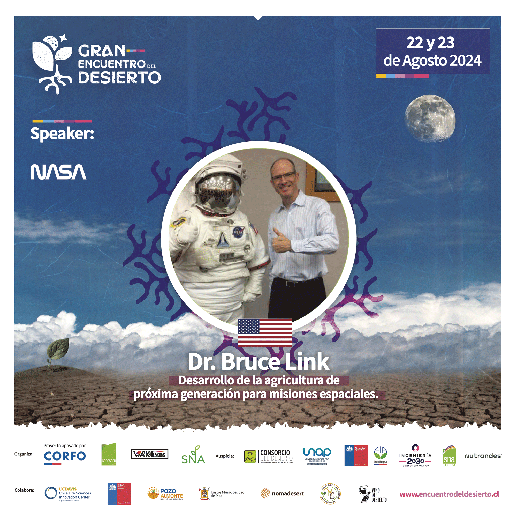 Entre los expositores invitados destaca el Dr. Bruce Link, experto en biotecnología, innovación y ciencias de las plantas comprometido con la resolución de problemas reales. Está apoyando a la NASA en los desafíos de alimentos y agua para misiones espaciales profundas (Luna y Marte), así como en ISRU para hacer que estas misiones sean más sostenibles. Le apasiona desarrollar nuevas innovaciones para resolver problemas en el espacio y en la Tierra.