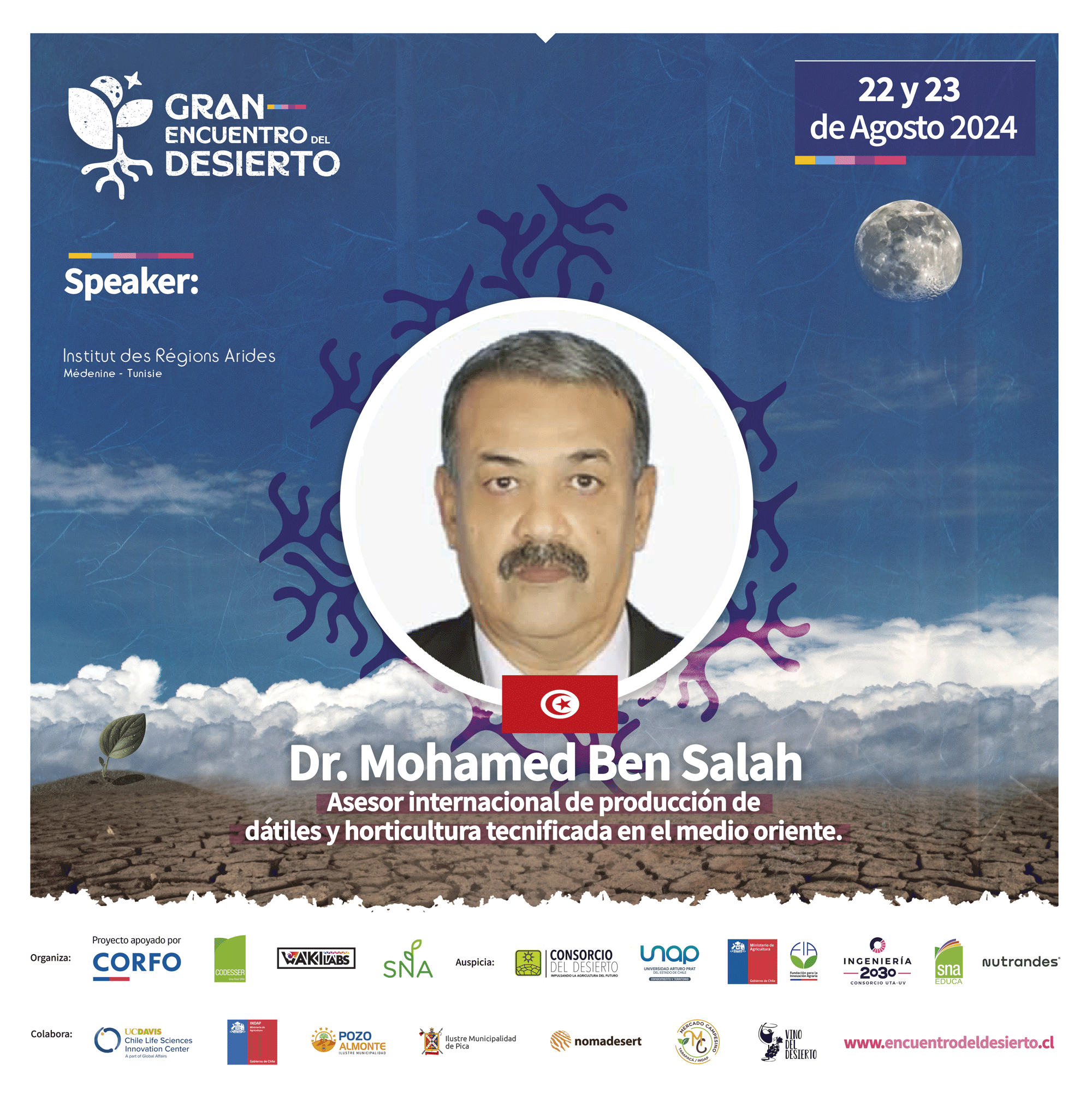 Asimismo, se presentará el Dr. Mohamed Ben Salah, del Arid Lands Institute-Tunisia. Es experto en ciencias de la producción vegetal y desarrollo sostenible con una carrera que abarca más de cuatro décadas. Posee un doctorado en ciencias de la producción vegetal del Instituto Nacional Agronómico de Túnez, y una maestría en desarrollo sostenible de la Universidad de Le Mans, Francia. Ha dirigido el Centro Regional de Investigación Agrícola de los Oasis en Degache, y lideró proyectos internacionales en Omán.