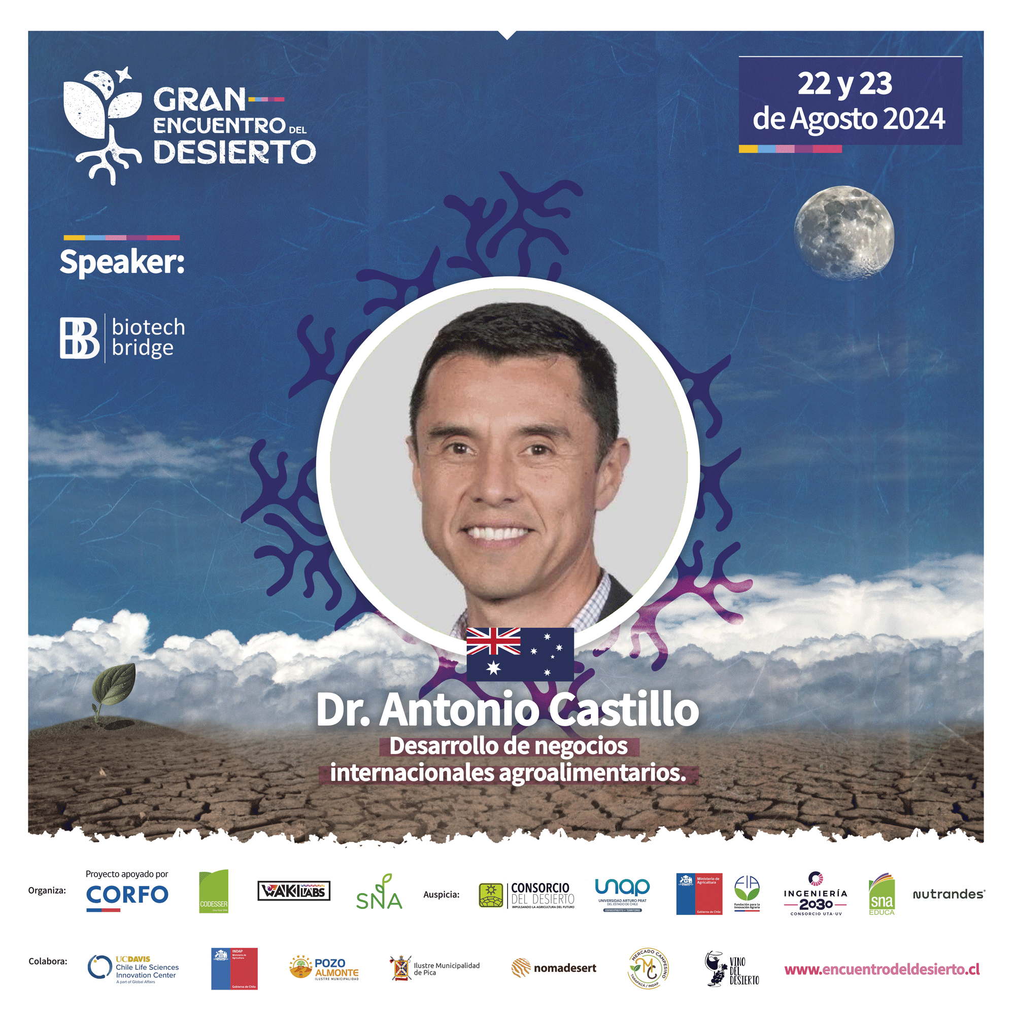 Desde Australia, llegará el Dr. Antonio Castillo, fundador y director de BiotechBridge, una empresa especializada en Biotech, Medtech y AgriFoodtech que facilita el desarrollo empresarial en Australia, América Latina e Israel. Posee un doctorado en genética molecular, una maestría en biotecnología y una licenciatura en acuicultura. Además, lidera la comercialización, investigación y relaciones gubernamentales en esos mercados.