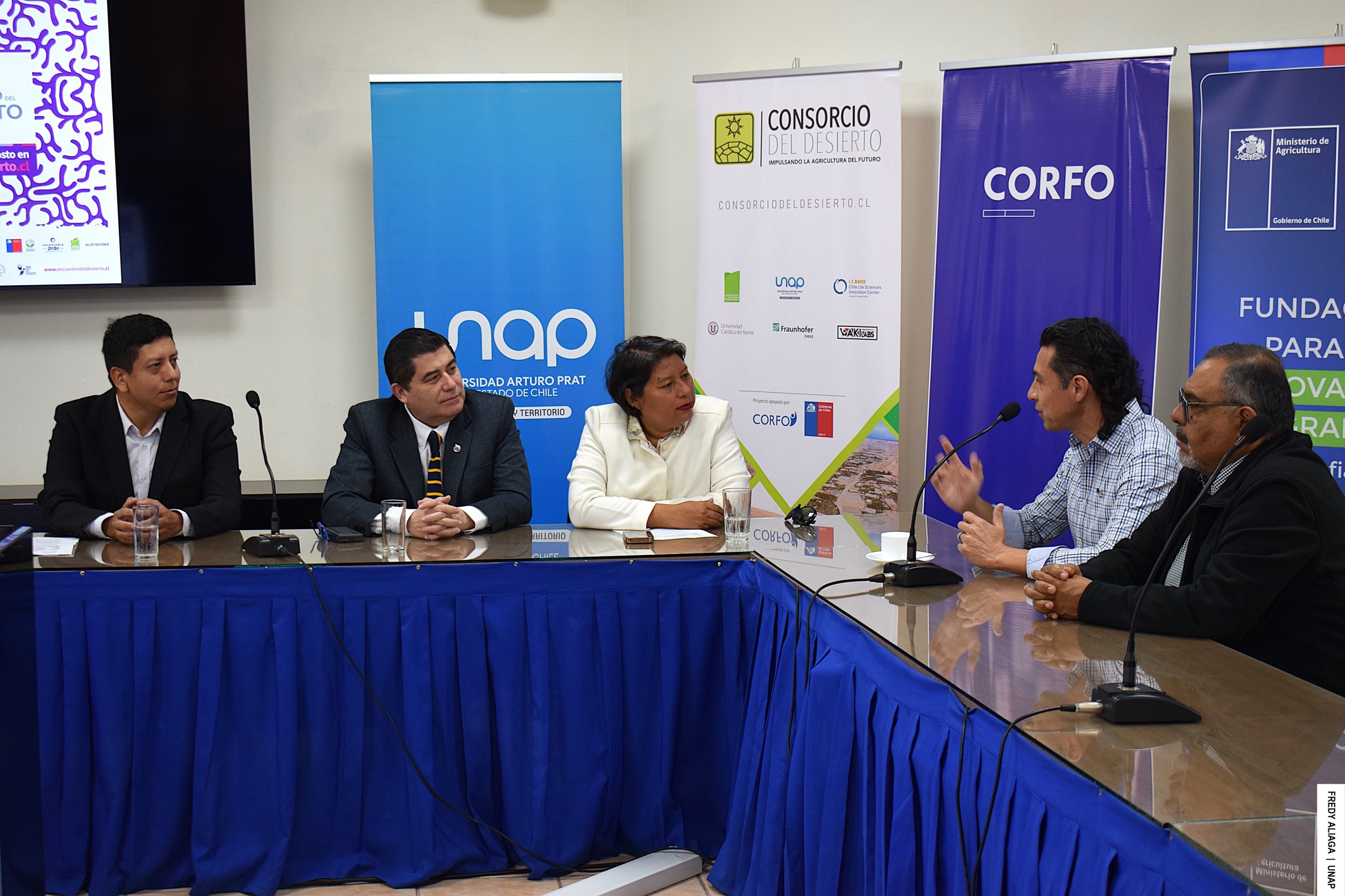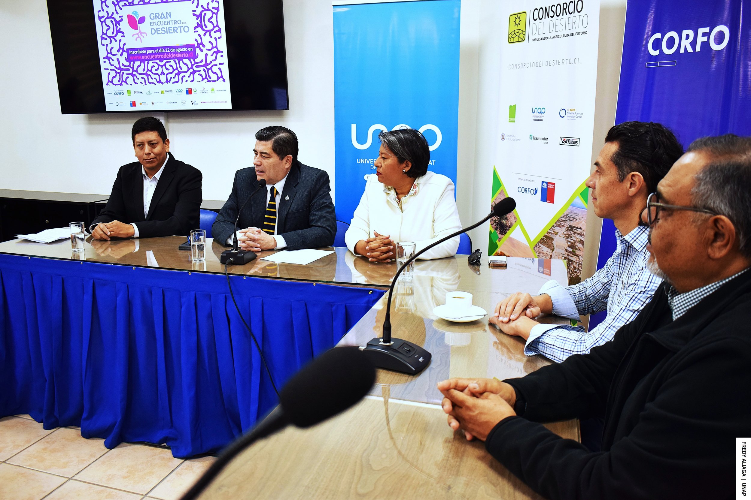 El lanzamiento oficial del “Gran Encuentro de Agricultura del Desierto” se realizó en la Casa Central de la UNAP, en Iquique, con representantes de las instituciones organizadoras. Estuvo el rector de la UNAP, Alberto Martínez Quezada; el seremi de Agricultura de Tarapacá, Eduardo Justo; la directora regional de Corfo, Catalina Cortés; el director de la empresa Waki Labs, Patricio Arias; y del Consorcio del Desierto y Codesser, David Quiroga.