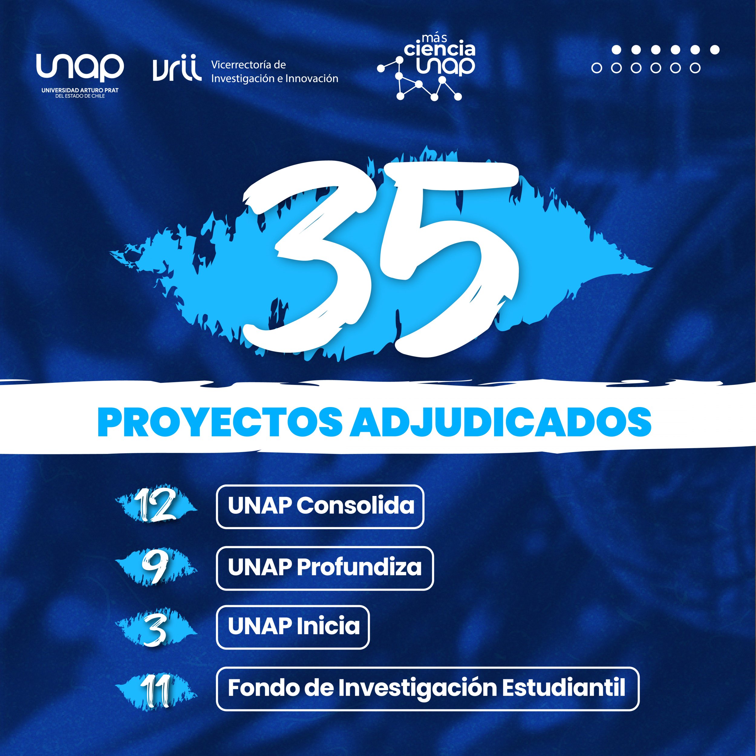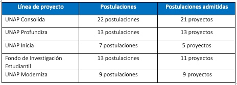 Se recibieron 55 postulaciones en cuatro líneas de proyectos: UNAP Consolida, UNAP Profundiza, UNAP Inicia y el Fondo de Investigación Estudiantil. Tras un riguroso proceso de evaluación, se declararon admisibles 50 propuestas, de las cuales 35 fueron adjudicadas.