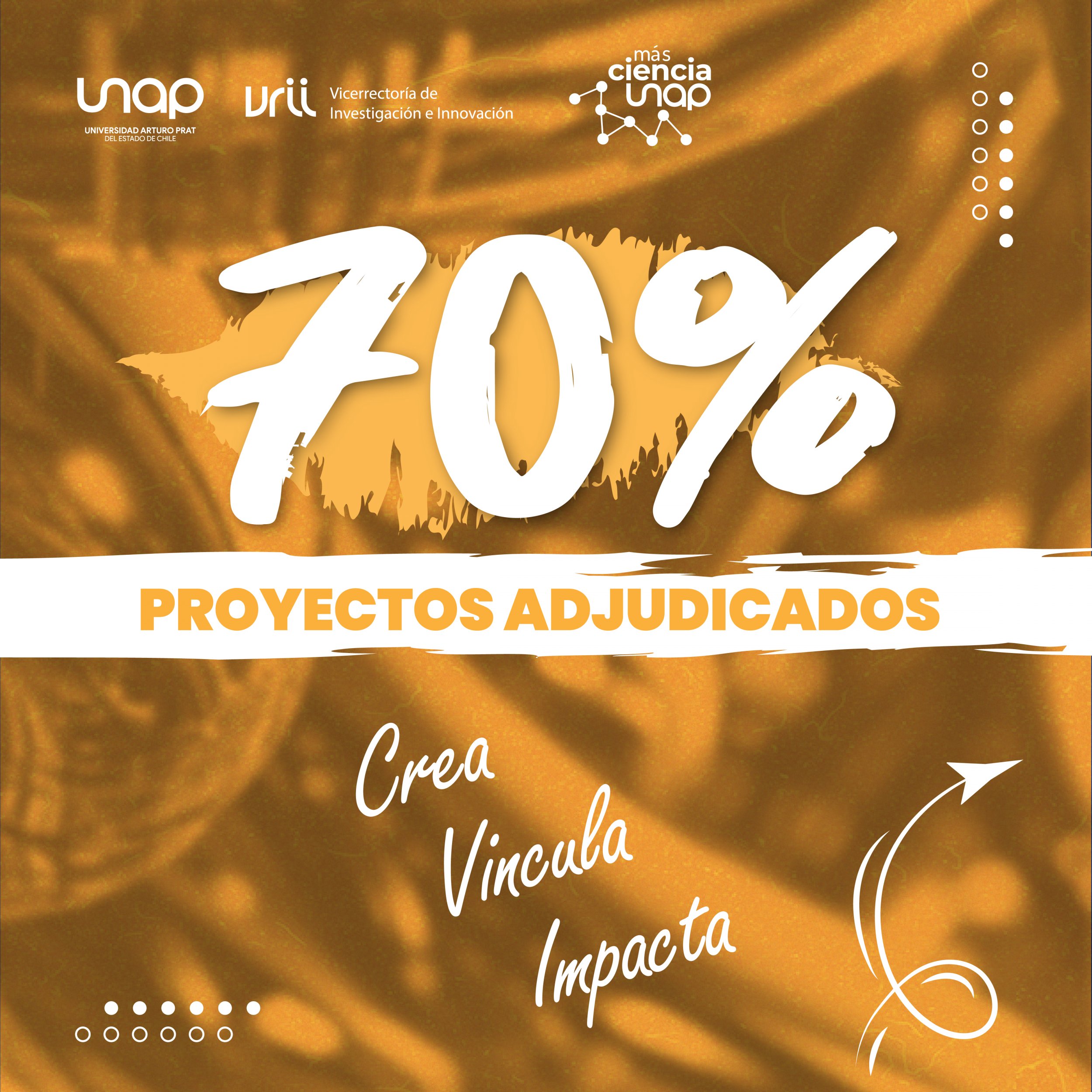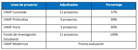 Se han adjudicado 35 de las 50 propuestas declaradas admisibles en las líneas UNAP Consolida, Profundiza, Inicia y Fondo de Investigación Estudiantil, lo que representa una tasa del 70% de adjudicación, a saber: