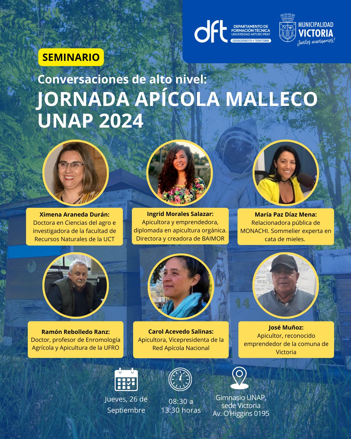 Nacido con el propósito de potenciar a esta importante área en la provincia, la carrera Técnico de Nivel Superior (TNS) en Agropecuario de la Universidad Arturo Prat Sede Victoria, en conjunto con la Unidad de Desarrollo Económico Local (UDEL) del Municipio de la comuna, se complacen en invitar a todos los interesados al primer Seminario “Conversaciones de alto nivel: Jornada de Innovación y Emprendimiento Apícola”.